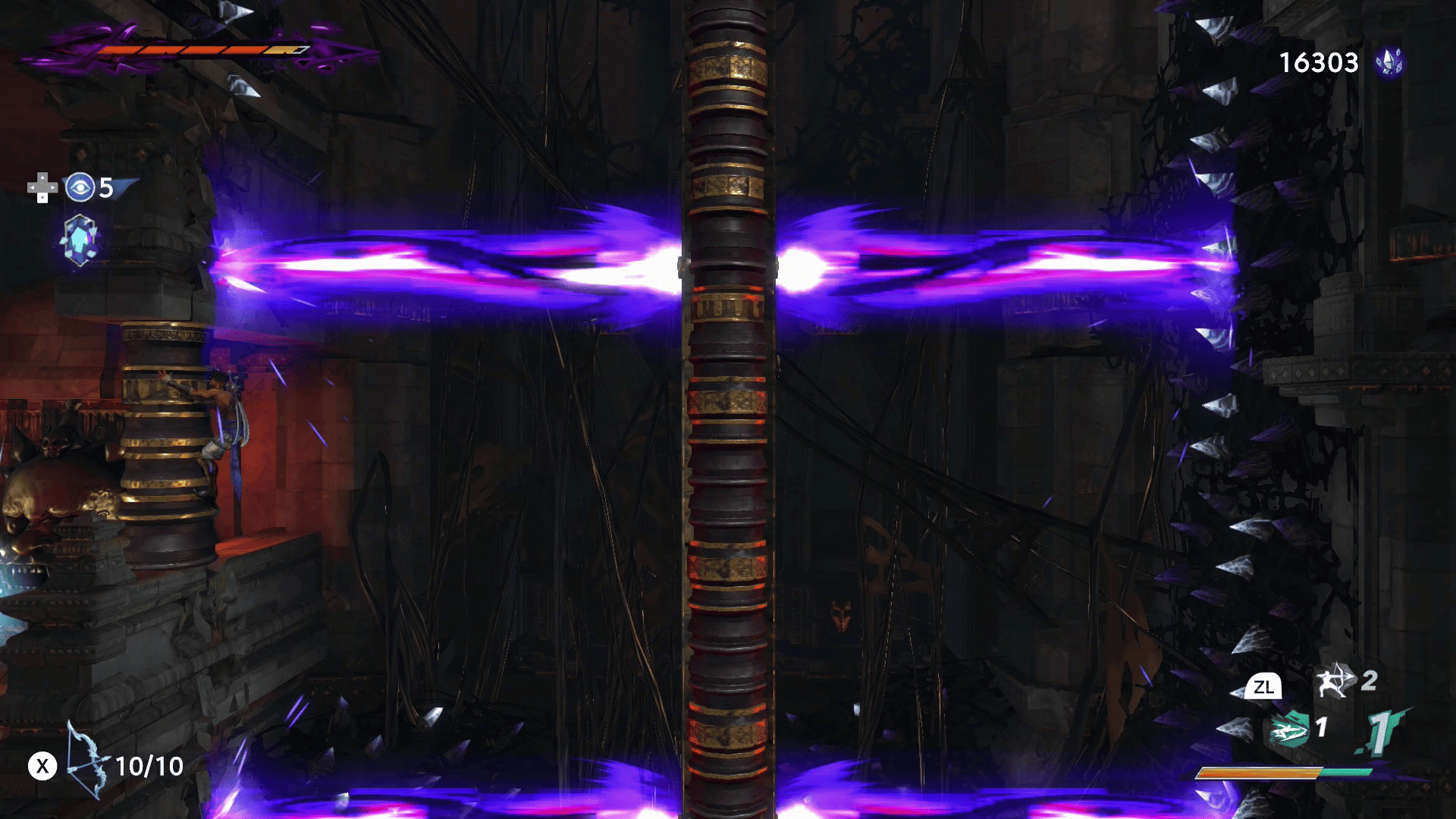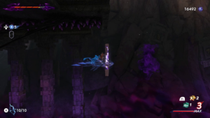 Nous aurons aussi des sortes de boules qui, une fois que nous frappons dessus, nous propulsent à un autre endroit. Il faudra un bon timing pour enchaîner les propulsions sans tomber. Pour renforcer la difficulté, nous devrons parfois frapper des objets (à l’arc ou à l’épée) pour ouvrir le passage en même temps que nous sommes propulsés. Nous devrons donc à la fois avoir un bon timing, mais aussi une bonne précision.
