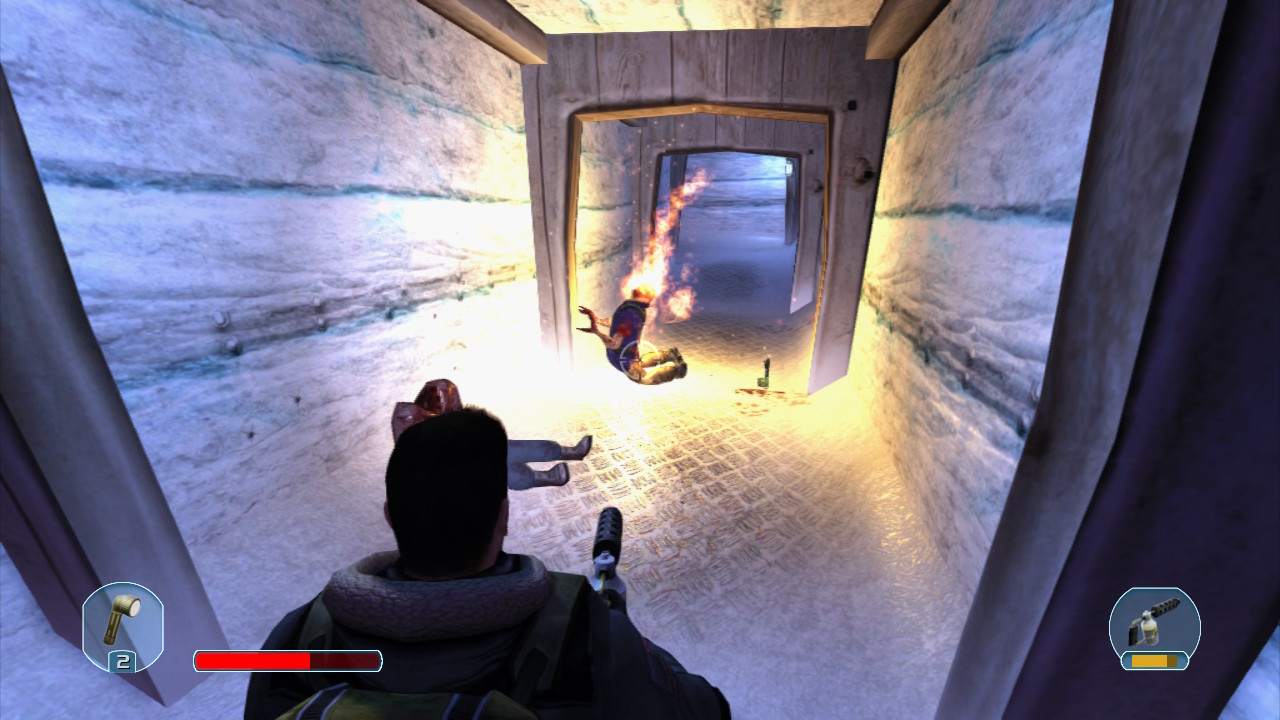 Pour le reste, le déroulement est 100% identique au jeu d’origine ; on commence dans la base américaine, avant de s’enfoncer dans les profondeurs d’une base sous-marine, sans oublier un laboratoire secret et des souterrains, avant de revenir à la surface. Les environnements s’avèrent donc plutôt variés. Il y a également une dernière petite subtilité que nous n’avons pas évoqué plus haut et qui est relative aux passages en extérieur. Antarctique oblige, notre personnage est confronté à des températures négatives ; cela se caractérise par une barre de froid qui se vide à mesure que l’on évolue dans les zones enneigées. Une fois celle-ci réduite à néant, c’est votre barre de vie qui sera rapidement mise à mal, provoquant ensuite la mort de votre personnage par hypothermie. Mais de manière générale, cette « menace » n’en sera jamais vraiment une du moment que vous restez sur les sentiers balisés dans la neige, le long desquels vous trouverez des abris pour vous réchauffer.