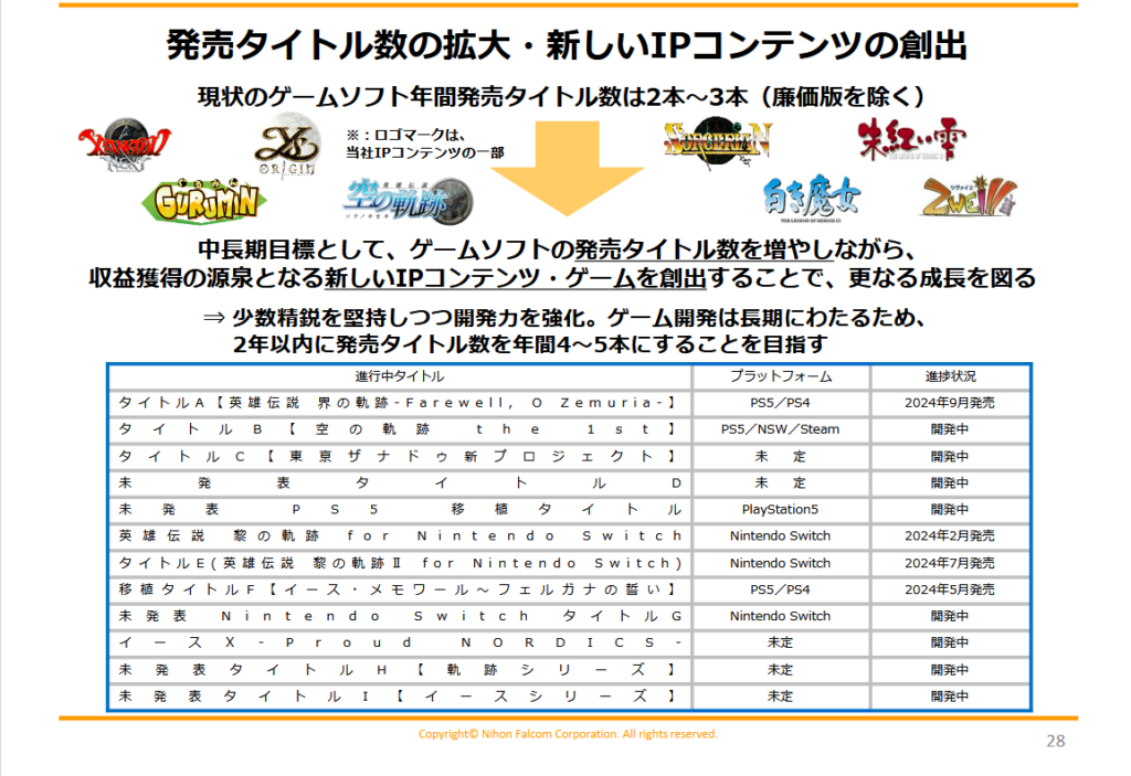 Développement de Falcom et ses jeux sur Nintendo Switch afin de viser une augmentation de ses bénéfices. Falcom a ainsi sorti en 2024 au Japon, Trails through Daybreak et Trails through Daybreak II. Jusqu’à Septembre 2025, l’objectif est de sortir Trails in the Sky the 1st ainsi que 2 autres jeux sur Nintendo Switch. Reste à savoir s’il s’agit des récentes annonces de Ys Vs Trails in the Sky et de Ys: Memories of Celceta ou si nous avons affaire à autre chose. Par ailleurs, sur le graphique en orange nous avons des estimations d’exemplaires de jeu vendu au Japon sur Nintendo Switch et les estimations pour 2024 et 2025. Les autres couleurs représentent les Playstation et autres.