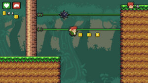 Visuellement, Aidan In Danger adopte un style rétro 2D qui pourrait être charmant si les environnements n’étaient pas aussi ternes et répétitifs. Les animations sont plutôt bien faites même si inégales. On passe du potable à l’absentéisme, le jeu proposant parfois des animations à peine croyables. Exemple : dès le premier monstre, un porc-épic surement pioché dans une banque de données libre de droit, meurt avec une animation de looping aussi simple que veillotte. Les arrière-plans sont plus génériques qu’un jeu flash sans assets, et le design des personnages manque cruellement de personnalité, tout comme le bestiaire qui se limite à 4 ou 5 monstres différents. Tout cela donne au jeu une sensation de projet amateur fait en 10 minutes avec des outils disponibles gratuitement sur internet.
