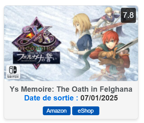 Combien de joueurs en local et / ou en ligne ? Quand sort le jeu ? Où le trouver sur Amazon / eShop ? Quelles sont les actualités autour de ce jeu ? Est-ce qu’un test est disponible ? La fiche est donc un futur élément central du site.
