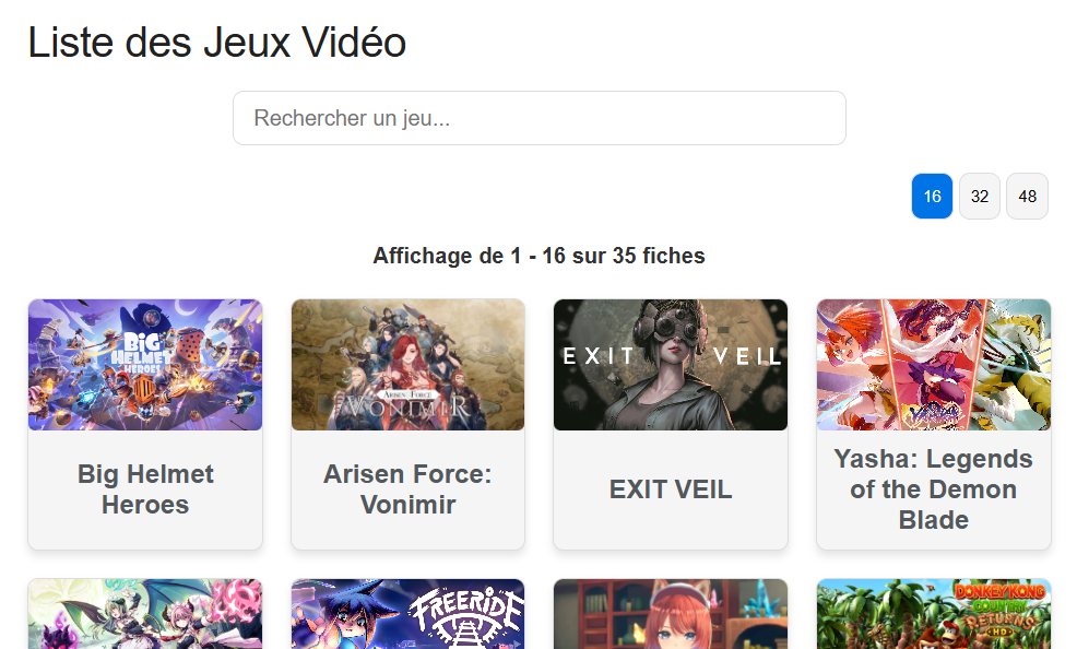 Nous vous avons aussi créé une page qui permet de regrouper toutes les fiches de jeux, vous pouvez faire une recherche, si la fiche existe alors elle apparaitra. Le tout sans chargement pour que ce soit le plus fluide et rapide pour vous.
