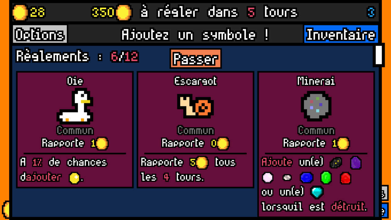 Le jeu est un roguelike deckbuilding au gameplay très simple et accessible. Nous lançons une machine à sous et chaque symbole nous permet de gagner de l’argent. Notre objectif est de réussir à amasser de l’argent en X tours afin de payer un loyer de plus en plus cher.