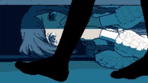 L’ambiance de Urban Myth Dissolution Center se distingue par deux côtés : tout d’abord son esthétique hyper attirante et mystérieuse en pixel art, qui met en opposition une palette de bleu avec des éclats de rouge qui contrastent et apportent une touche de tension. Les animations, notamment les expressions de visage, retranscrivent très bien les émotions, et l’ensemble de la direction artistique fonctionne parfaitement pour le titre sans jamais lasser. On se retrouve même parfois à contempler le design de certains screens comme on regarderait des pages de mangas.