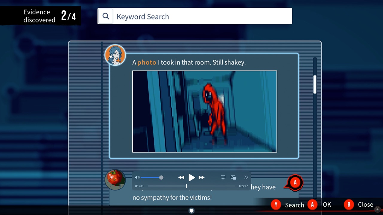 Le jeu est divisé en plusieurs chapitres, chacun équivalant à une enquête qui s’étend sur plusieurs jours. Le gameplay rappelle des classiques comme Ace Attorney, où vous devrez chercher des informations sur les réseaux sociaux (une sorte de Twitter/X), interroger des témoins, collecter des indices en faisant appel à vos pouvoirs, et faire des déductions pour résoudre des mystères. Ces moments de déduction sont particulièrement gratifiants lorsque vous avez réussi à regrouper tous les éléments correctement. Toutefois, pour ces phases, on notera que le titre exige que vous sélectionniez des phrases dans un certain ordre, alors qu’une autre « réponse », en inversant par exemple deux phrases, pourrait s’avérer correct également.