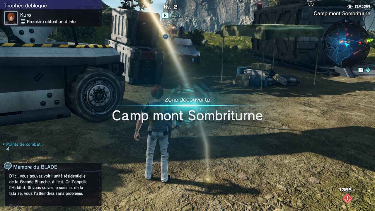 Une avalanche d’information arrivant très tôt si nous suivons le fil rouge du jeu, et que nous encaissons aussi maladroitement que notre protagoniste amnésique. Pourtant, et c’est là la différence avec les autres Xenoblade Chronicles encore aujourd’hui et qui met Xenoblade Chronicles X à part, nous avons ici une expérience en total Open World. Après avoir été sorti de stase et après une première cinématique où Elma nous présente la vue face à nous, la planète Mira et la route jusqu’à NLA, celle-ci nous donne un premier itinéraire relativement sûr jusqu’à la ville. Cependant, elle nous dit également que rien ne nous empêche de sauter de la falaise où nous sommes pour atteindre la ville via un autre itinéraire même si la faune est bien plus dangereuse. A partir de là, le choix et la liberté reste à la main du joueur. Dans Xenoblade Chronicles X, pas de début de jeu très lent sur plusieurs chapitres faisant office de tutoriel : ici, une fois la présentation terminée, nous sommes libres.