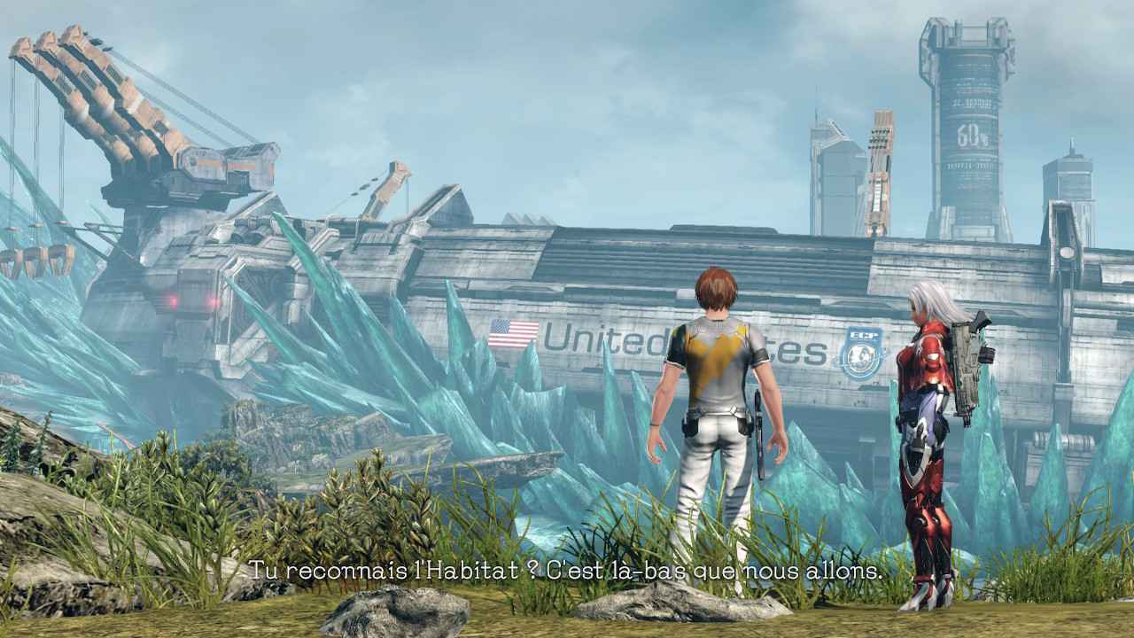Après le pari d’un JRPG plus shonen dans un univers plus fantastique mélangé à de la Science Fiction sur le premier Xenoblade, Monolith Soft est revenu à ses premiers amours de lore SF très dense avec Xenoblade Chronicles X. Nous démarrons avec une scène de conflit spatial se déroulant en l’an 2054. Alors que 2 armées extraterrestres se livrent une violente bataille près de la planète terre, l’humanité tente de se défendre et de trouver un moyen d’échapper à ce feu croisé. La violence est telle que la planète est détruite dans la bataille, mais l’humanité parvient à mener un plan d’évacuation in-extremis en embarquant les habitants et ses villes à travers plusieurs immenses arches interstellaires. Toutefois, plusieurs de ces arches sont détruites par les flottes extraterrestres durant le conflit. Xenoblade Chronicles X s’attarde sur l’arche interstellaire des Etats-Unis, arrivant à échapper aux armées ennemies et à se retrouver à la dérive dans l’espace.