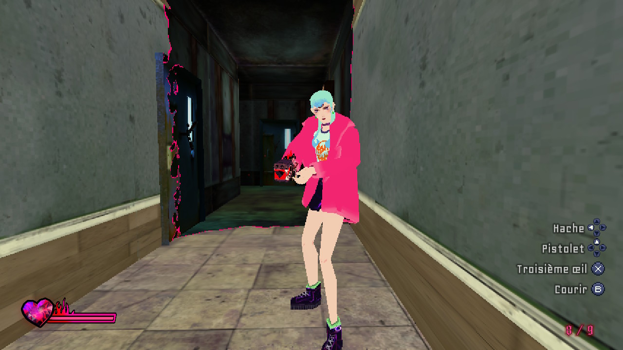 Dans l’absolu le jeu s’avère très maniable avec des caméras bien placées et propose des commandes plutôt intuitives, que l’on soit un habitué du genre ou non. Pour les vieux de la veille, il est même possible d’opter pour des contrôles « Tank » (vous poussez le joystick vers le haut et le personnage ira droit devant, quel que soit l’angle de caméra). De notre côté, nous avons opté pour les contrôles « modernes », qui font très bien le job. Comme dans tout bon Survival Horror qui se respecte, vous pourrez compter sur la traditionnelle arme de poing. Ici c’est une hache, répondant au doux nom de « Gueule de démon », le pistolet est également présent mais en lieu et place d’un classique Beretta, vous serez équipé.e d’un Chien de l’enfer… Enfin, vous obtiendrez plus tard dans votre progression le traditionnel et dévastateur fusil à pompe qui ronronne quand on le tient et qui porte l’appellation de Feu infernal ! Vous entrerez également en possession (avant votre affrontement contre le premier boss) d’un artefact ultra puissant nommé Crève-Cœur dont nous allons vous reparler un peu plus tard. Outre les noms un peu particulier des armes dont vous pourrez disposer, l’une des autres particularités du titre est le passage en mode à la première personne quand on appuie sur la touche pour viser (LR) : vous devrez ensuite viser les ennemis et c’est là que votre Oculus Tertiaire entre en jeu. Pour parler plus vulgairement, le troisième œil que vous pourrez ouvrir d’un simple claquement de doigt (ou d’une pression sur le bouton X), fera alors sursauter un peu vos adversaires mais aura aussi la particularité de dévoiler leurs points faibles (via des cœurs qu’il faudra dégommer). Il sera toutefois possible de tirer sur les ennemis sans viser leurs points faibles, mais les dégâts seront alors réduits.