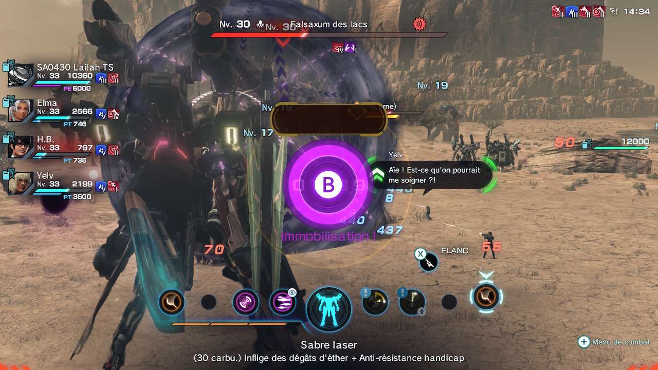 Comme durant notre exploration, en combat les Skells consomment du carburant. Le carburant permet de déclencher nos Arts et il est important de surveiller celui-ci. Il est possible de récupérer du carburant en combat par immobilisation de notre adversaire. L’immobilisation est une mécanique propre aux Skells que nous pouvons déclencher après avoir déséquilibré un ennemi avec un Art. À pied, nous pouvons enchainer avec un Art pour faire chuter l’ennemi et temporairement l’immobiliser. En Skell c’est une mécanique similaire aux QTE en B et le temps d’immobilisation dépend de notre capacité à appuyer au bon moment. Durant l’immobilisation, notre carburant remonte et l’I.A. est également programmée pour se ruer vers un ennemi déséquilibré pour l’immobiliser, même si elle s’en sort pas aussi bien qu’un joueur. Il est aussi possible de combattre les ennemis dans les cieux en débloquant le module de vol.