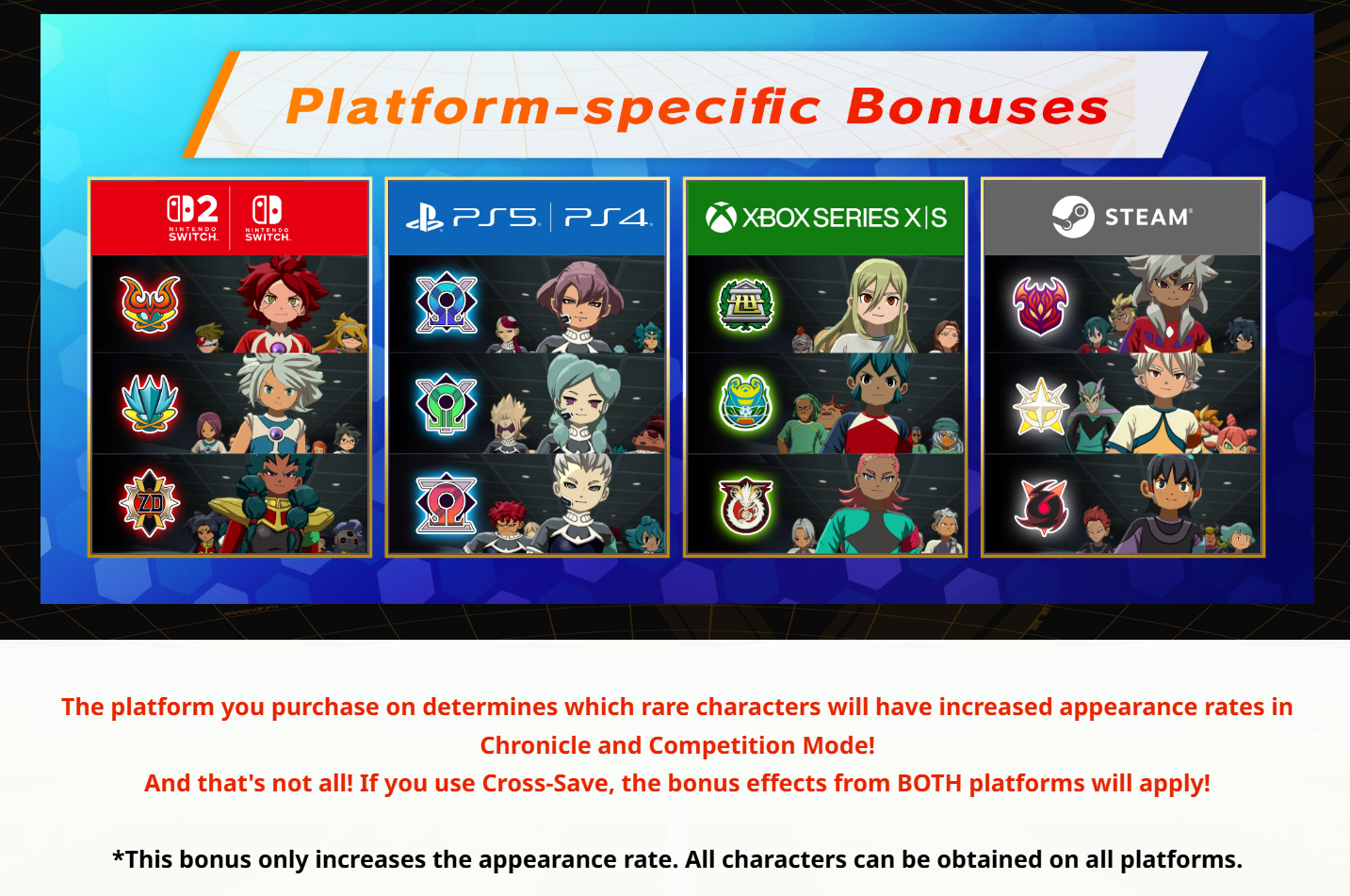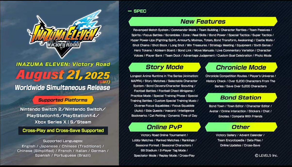 Inazuma Eleven : Victory Road intègre désormais le cross-play et le cross-save entre Xbox, Steam, PlayStation, Nintendo Switch et Nintendo Switch 2, permettant ainsi aux joueurs de concourir et de progresser sur différentes plateformes. Dans le Mode Chronicle, la narration se poursuit avec le retour de personnages emblématiques comme Wunderbear et l’apparition d’un Fei Rune adulte, servant principalement à justifier la reprise des combats de tous les jeux. Par ailleurs, le jeu semble reprendre les éléments EG, et il est évoqué l’existence possible d’un système de gacha pour débloquer des personnages.