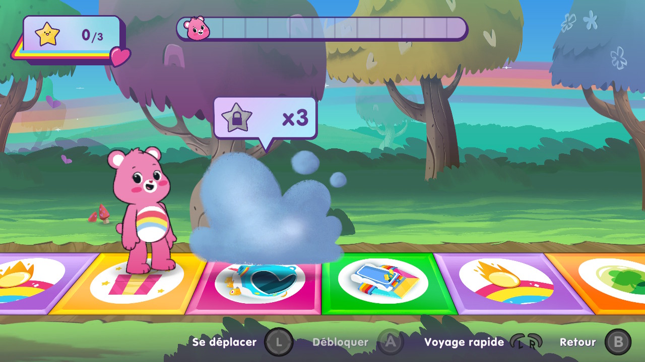 Commençons donc notre exploration avec le mode Aventure (qui correspond au mode histoire absent du jeu en réalité…). L’aventure commence donc sur un plateau de jeu en 2 dimensions faisant de prime abord penser à Mario Party (ou un autre party game du même genre)… On apprend en quelques mots qu’il faut collecter des étoiles pour libérer à nouveau la magie en progressant sur le plateau et en remportant des mini-jeux pour gagner les étoiles et là on se dit : « Ah cool, un pseudo Mario Party avec les Bisounours ! ». Mais très vite, on réalise que la dimension « jeu de plateau » que l’on espérait n’existe pas… Notre Bisounours imposé (GrosFarceur pour les connaisseurs), devra donc évoluer sur ce pseudo plateau comme bon lui semble (vers la droite de préférence), jusqu’à se retrouver face à un nuage noir qu’il faudra faire disparaitre en ayant collecté le nombre d’étoiles nécessaires (elles vont par paquets de cinq pour commencer).