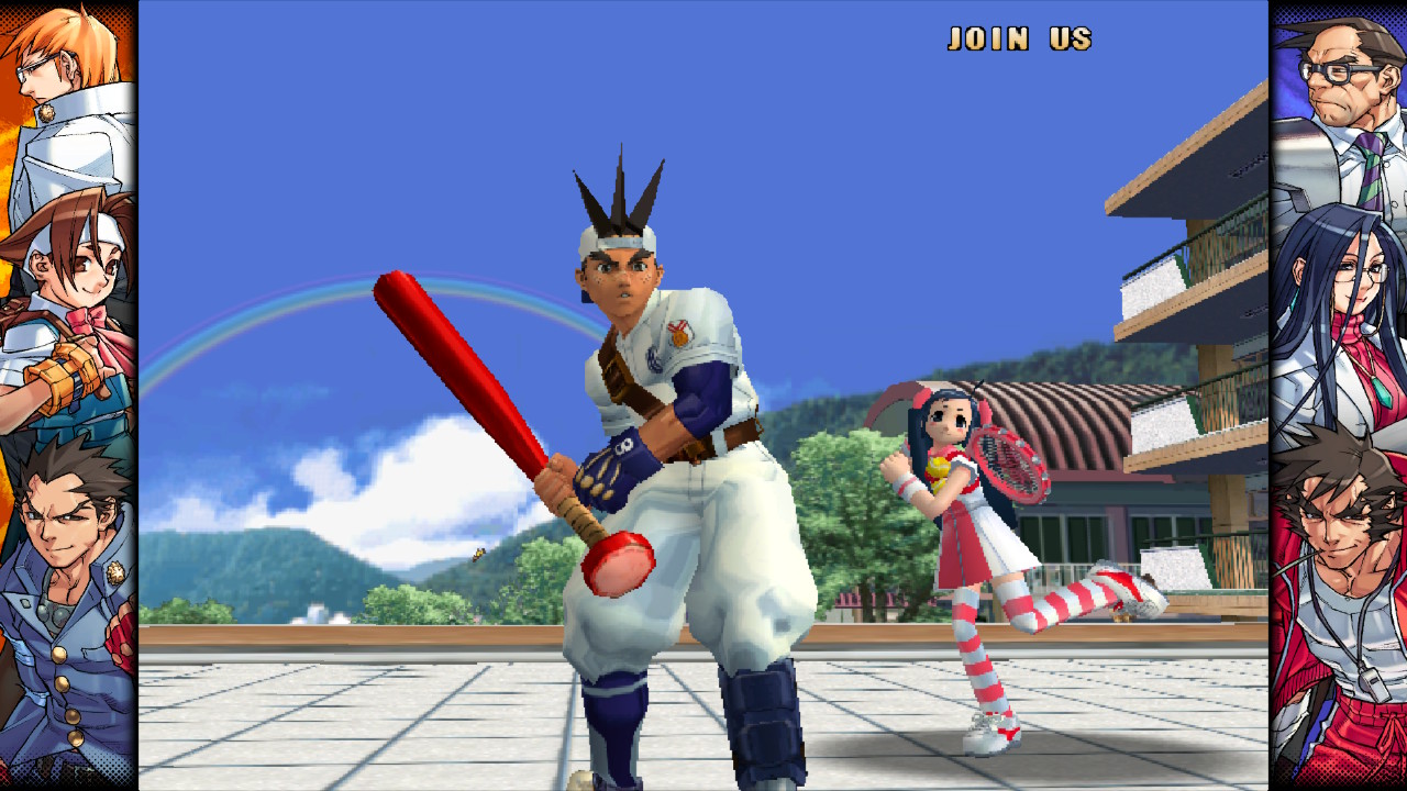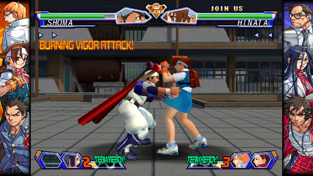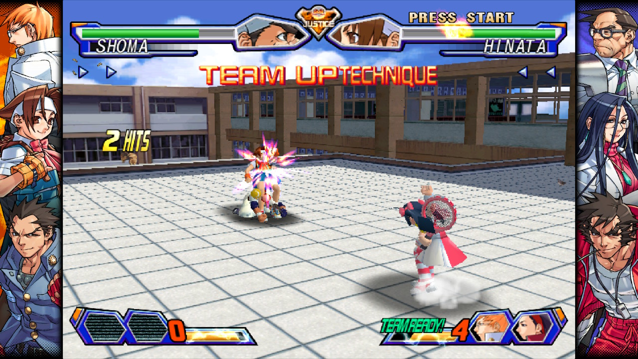 Project Justice quand à lui, joue un peu dans la même cour (de récréation).. ; reprenant l’univers un poil déjanté de Rival Schools (dont il est la suite), ce nouvel opus permet encore une fois de choisir entre des personnages jouant avec les clichés de l’univers scolaire » (les sportifs avec un footballeur, un joueur de base-ball, une joueuse de Volley-Ball. Une joueuse de musique, l’infirmière scolaire ou la pom-pom girl adepte de Kick-Boxing…) La grande force de Project Justice, c’est son univers et ses personnages clichés au possible, mais très charismatiques. Par contre, on vous prévient de suite, le mode jeu de plateau disponible sur la version japonaise Dreamcast n’est pas disponible ! En effet, la compilation contient le jeu en version arcade… Il est toutefois possible de sélectionner des personnages « éditables » (pour le coup déjà édités). Mais le titre n’est toutefois pas dépourvu d’un mode histoire vous permettant de vivre une campagne scénarisée unique vous permettant de suivre les aventures de 7 groupes provenant d’écoles différentes. Au niveau du système de jeu, on peut se composer une équipe de 3 personnages qu’il est possible d’appeler en cours de combat pour lancer une attaque spéciale en équipe absolument dévastatrice (et souvent assez drôle).