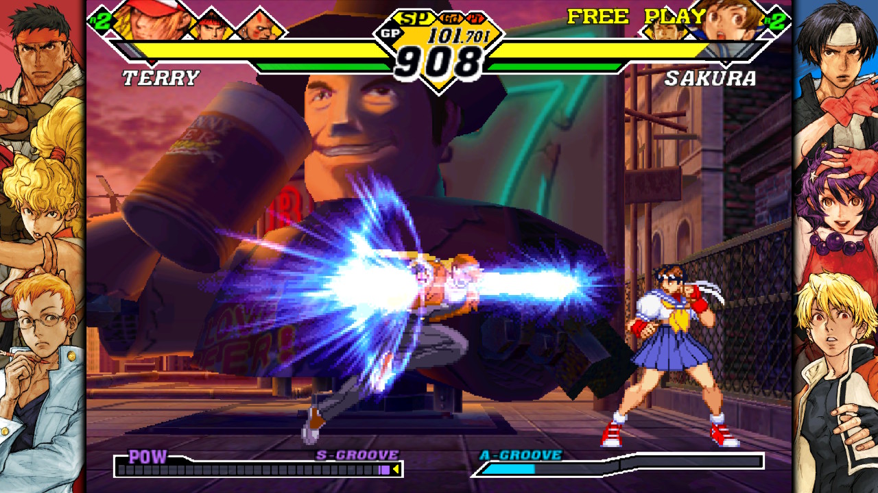 A l’époque, on se tirait un peu la bourre pour savoir qui était le plus fort entre Ryu et Terry Bogard… Est-ce que les Jeux de baston Capcom étaient meilleurs que ceux de SNK ? Ironiquement, les deux sociétés mirent fin à des années de combat dans les cours de récré, pour proposer la rencontre entre les deux univers. Capcom vs. SNK: Millennium Fight 2000 Pro, sorti en comme son titre l’indique en 2000, apporte un début de réponse à ce choc tant attendu. Néanmoins, vous noterez que la version présente ici est suffixée d’un PRO, il s’agit en effet du jeu sorti en 2001 apportant deux personnages en plus au jeu Original (Dan Hibiki de Street Fighter et Joe Higashi de Fatal Fury), portant ainsi le roster à 35 personnages ! (avec un personnage de plus pour Capcom). Outre cette généreuse proposition en personnages, le jeu vous propose de choisir entre deux modes… enfin deux « groove ». Le Capcom Groove s’approche du système A-ISM de Street Fighter Alpha 3. La jauge de puissance se divise en trois sous-parties de même taille se remplissant l’une après l’autre, on peut alors lancer des attaques spéciales de trois niveaux différents (correspondant à un, deux ou trois niveaux de jauge remplis). Le Snk Groove quand à lui propose une seule barre à remplir, comme pour la série The King Of Fighters.