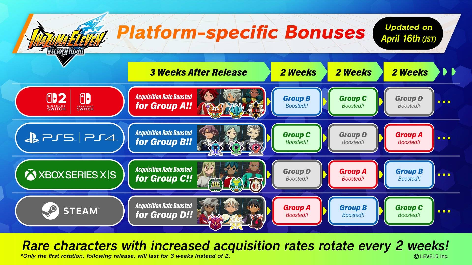 Désormais, les taux de drops augmentés ne sont plus uniques à chaque plateforme mais disposent d’un système de rotation. Ainsi, les 3 premières semaines, les joueurs de la Switch (ainsi que de la Switch 2) ont un taux de drop augmenté pour le groupe A (qui est composé de Zanark, Torch et Gazelle. Ensuite, la rotation s’effectue vers le groupe B (composé d’Alpha, Beta et Gamma), enchainé ensuite par le groupe C (Byron Love, Helio et Quentin) pour conclure avec (Tezcat, Bailong et Bash Lancer)