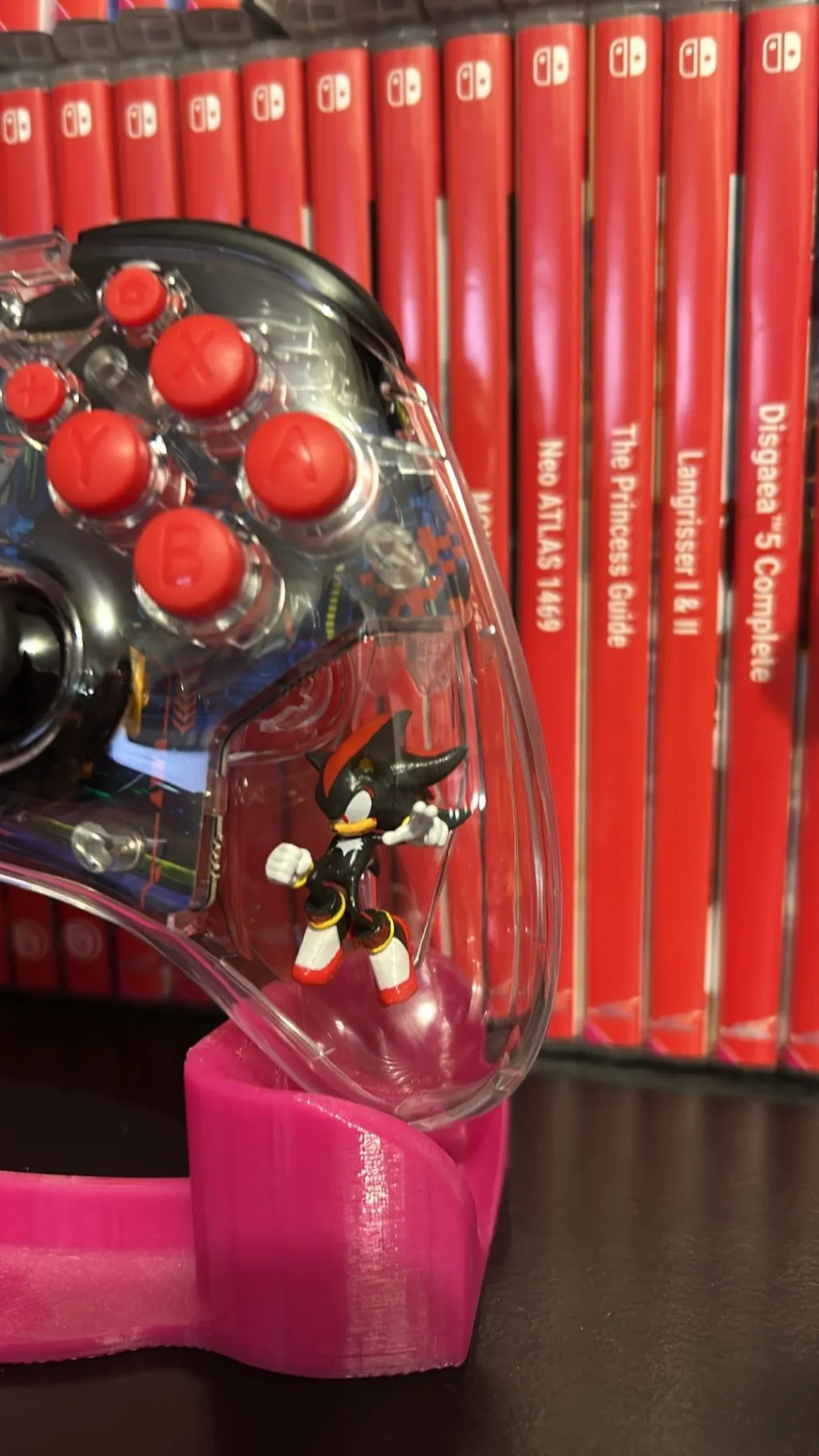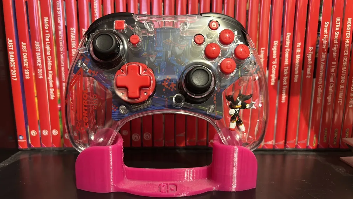 Le premier élément qui saute aux yeux est la figurine de Shadow incrustée dans la poignée droite, comme suspendue au milieu de circuits futuristes. Le design transparent de la manette met en scène la Colonie spatiale ARK, un clin d’œil direct à l’univers de Sonic Adventure 2, avec un fond détaillé et bien peint. Les boutons noirs contrastent avec les éléments rouges, renforçant l’identité de Shadow.