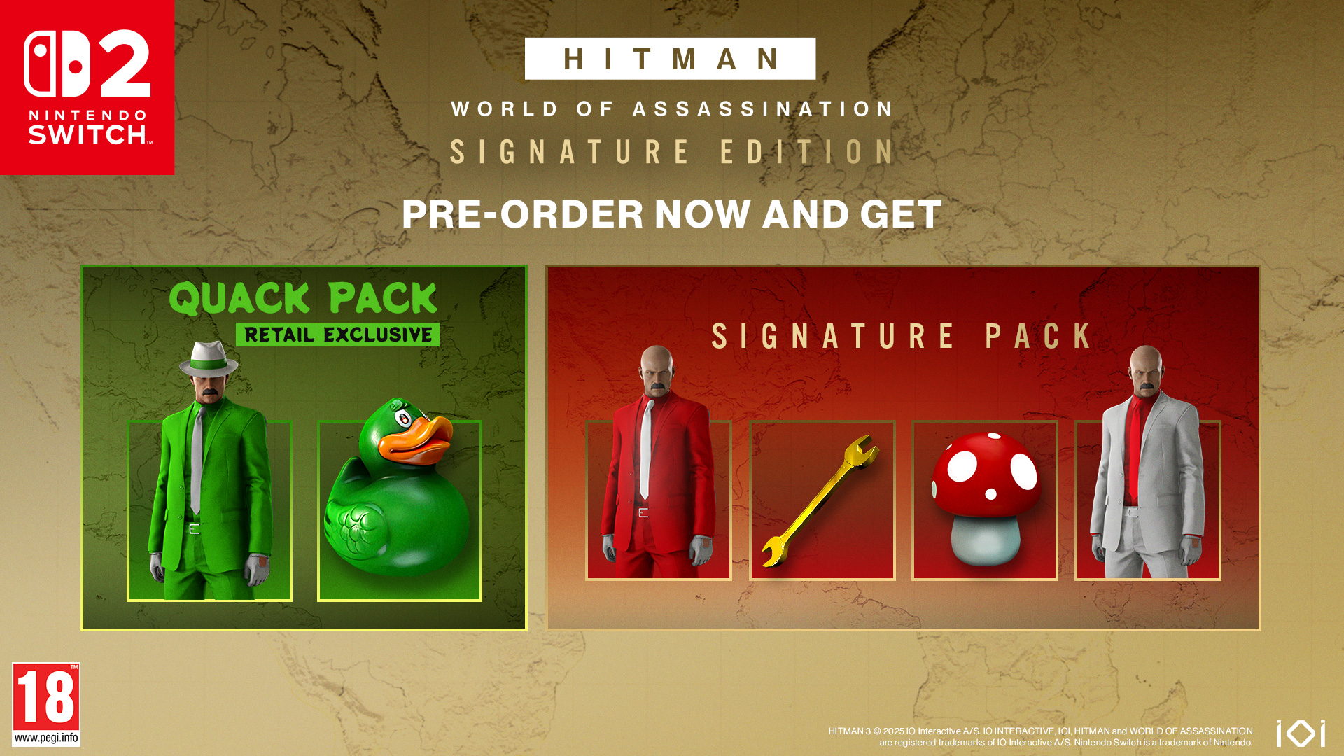 Les précommandes numériques de HITMAN World of Assassination – Signature Edition incluent également le “Signature Pack”, contenant deux tenues et objets supplémentaires. Les précommandes physiques incluront le Signature Pack et le Quack Pack, à la fois meurtrier et couinant, qui propose une tenue et un objet supplémentaires.