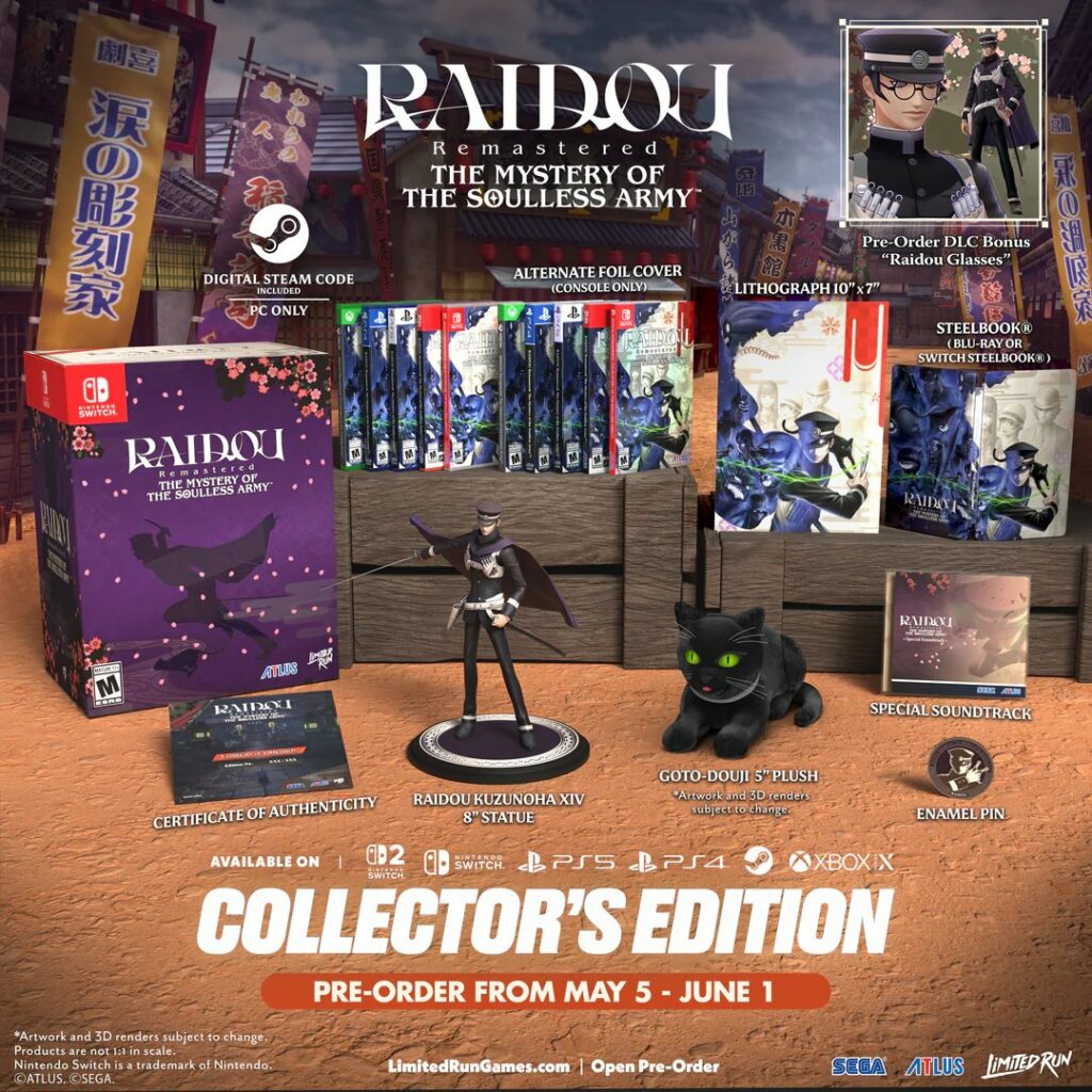 Le pack collector de RAIDOU Remastered inclura le jeu « complet », un bonus de précommande « Raidou Glasses », une couverture alternative en édition foil exclusive aux consoles, un somptueux SteelBook, la bande-son spéciale du jeu, une lithographie de 10”x7”, une adorable peluche Goto-Douji de 5”, une imposante statue de Raidou Kuzunoha XIV de 8”, un pin’s émaillé ainsi qu’un certificat d’authenticité pour garantir l’exclusivité de votre acquisition. Cette édition sera disponible en précommande pour une durée limitée et fermera ses portes le 1er juin 2025 à 23h59, heure de l’Est.