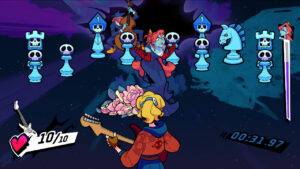 Graphiquement, le titre reprend le pixel-art modernisé cher à Brace Yourself Games : personnages expressifs, décors stylisés et particules dynamiques, sans jamais sacrifier la lisibilité même dans les phases les plus chargées. Les options d’accessibilité sont, tout comme en mode calibration, particulièrement étoffées : ajustements de couleurs (mode daltonien), diminution des effets visuels et animations de combo, monstres statiques, barre d’indication de précision… Une preuve d’attention rare dans un jeu de rythme aussi exigeant, qui permet aux novices comme aux joueurs en situation de handicap de trouver leur équilibre.