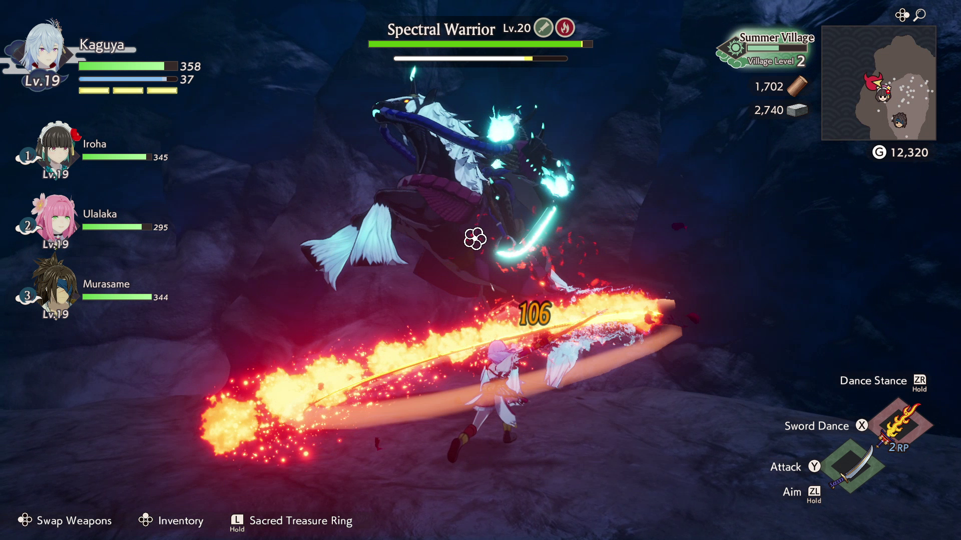 L’utilisation du trésor sacré coute des PR, une ressource qui s’avère rapidement trop peu nombreuse pour une journée. Car ces trésors ne servent pas qu’en combat : si en combat ils nous sont utiles contre des ennemis faibles à notre élément, ils vont aussi nous servir pour purifier le terrain et ainsi comme dans un metroidvania vous faire découvrir de nouveaux endroits dans des mondes ouverts. L’utilisation d’une attaque varie entre 2 et 3 PR, ce n’est pas beaucoup, mais quand on fait un enchaînement de 4 coups c’est déjà 12 PR potentiellement qui partent et au début nous n’en avons vraiment pas beaucoup, 20 PR, autant dire que l’on est vite limité. Surtout que ces trésors ont donc plusieurs utilités, en combat, pour l’exploration, mais aussi pour s’occuper du jardin, par exemple utiliser le tambour fait avancer d’un jour la pousse de nos plantations, sachant que la portée est assez limitée, quand notre terrain commence à grandir, on utilise beaucoup de coups de tambours. De plus si on fait avancer d’un jour, que l’on récolte et que l’on replante, nous devons de nouveau leur donner un coup de tambour pour gagner une journée. Les PR fondent comme neige au soleil. En avançant dans le jeu, leur nombre va augmenter, mais le nombre de villages aussi tout comme la taille de nos terrains. Ce qui nous laisse plus beaucoup de PR pour la partie combat, nous allons alors principalement utiliser l’attaque de base.
