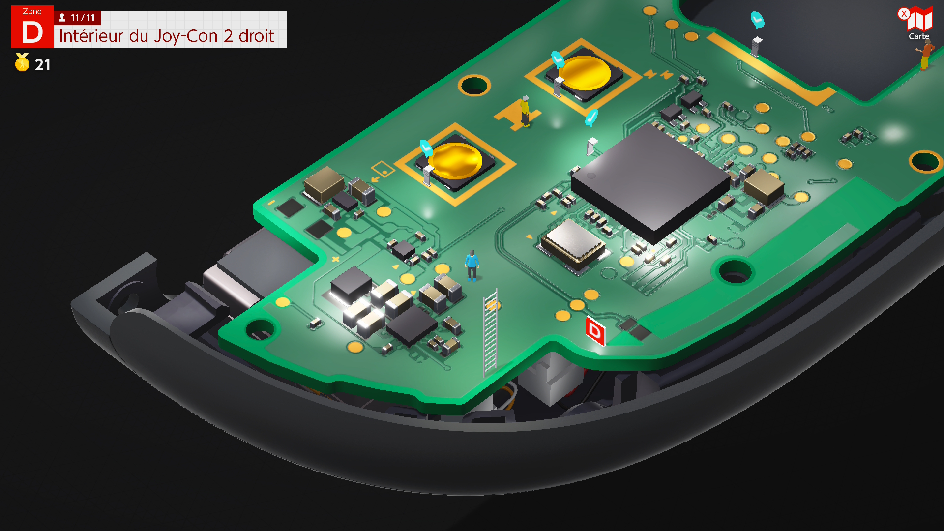 Cependant, l’intégralité des secteurs à visiter ne sera pas disponible d’entrée de jeu : pour progresser sur la console, il faudra trouver l’ensemble des tampons cachés aux 4 coins des différentes zones de jeu, pour aller à la suivante… Ces derniers ne seront toutefois pas très difficiles à trouver et apparaissent lorsque l’on passe à proximité (cherchez près des boutons ou des emplacements des vis).