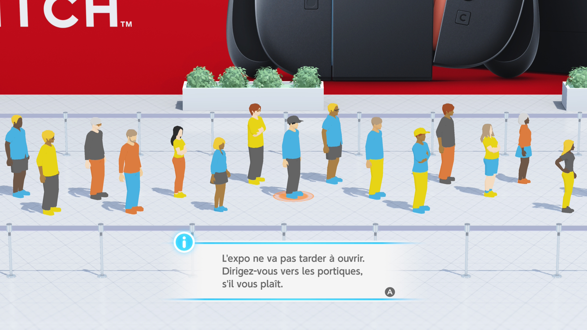 L’aventure commence dans une file d’attente (semblable à celle que certain(e)s ont peut-être vécue lorsqu’ils sont allés chercher leur console le jeudi 5 juin au matin (ou dans la nuit). Nous sommes alors invités à choisir un personnage dans la file qui se presse (fille, garçon, grand, petit, barbu, chauve, chevelu…), on ne perd pas de temps à se customiser un Mii ou un personnage, on prend le premier (ou la première) qui vient et qui nous servira d’avatar pour « l’aventure » à venir. Sachez que l’apparence des personnages rappelle fortement celle des coachs de Wii Fit (peau blanche et traits du visage à peine visibles), ça change des Mii à personnaliser, mais ça permet de gagner du temps (sauf si vous cherchez un perso qui vous ressemble), le bon côté, c’est qu’une fois votre personnage sélectionné, vous prenez la tête de la file et vous entrez directement dans l’attraction, en passant un petit portique… Vous voilà sur le Joy-Con gauche d’une Switch 2 géante ! Un petit tour par le bureau d’information qui se trouve juste à côté du stick et à vous le plaisir de la découverte…