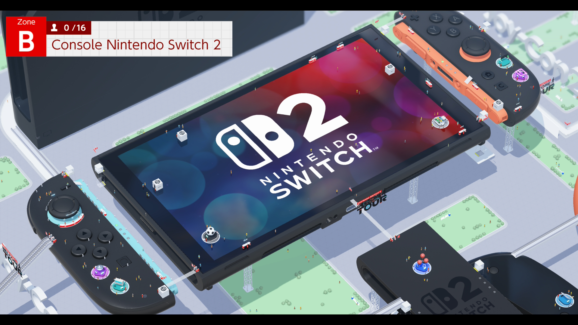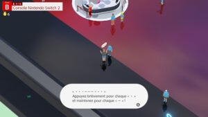Nous sommes alors invités à déplacer notre personnage au cœur de cette Nintendo Switch 2 géante. La vue est en 3/4 haut et les environnements sont en 3 dimensions. Il est possible de faire tourner la caméra (dans des angles fixes) autour de notre avatar et il est également possible d’avoir une vision d’ensemble de la console (et de certains accessoires…).