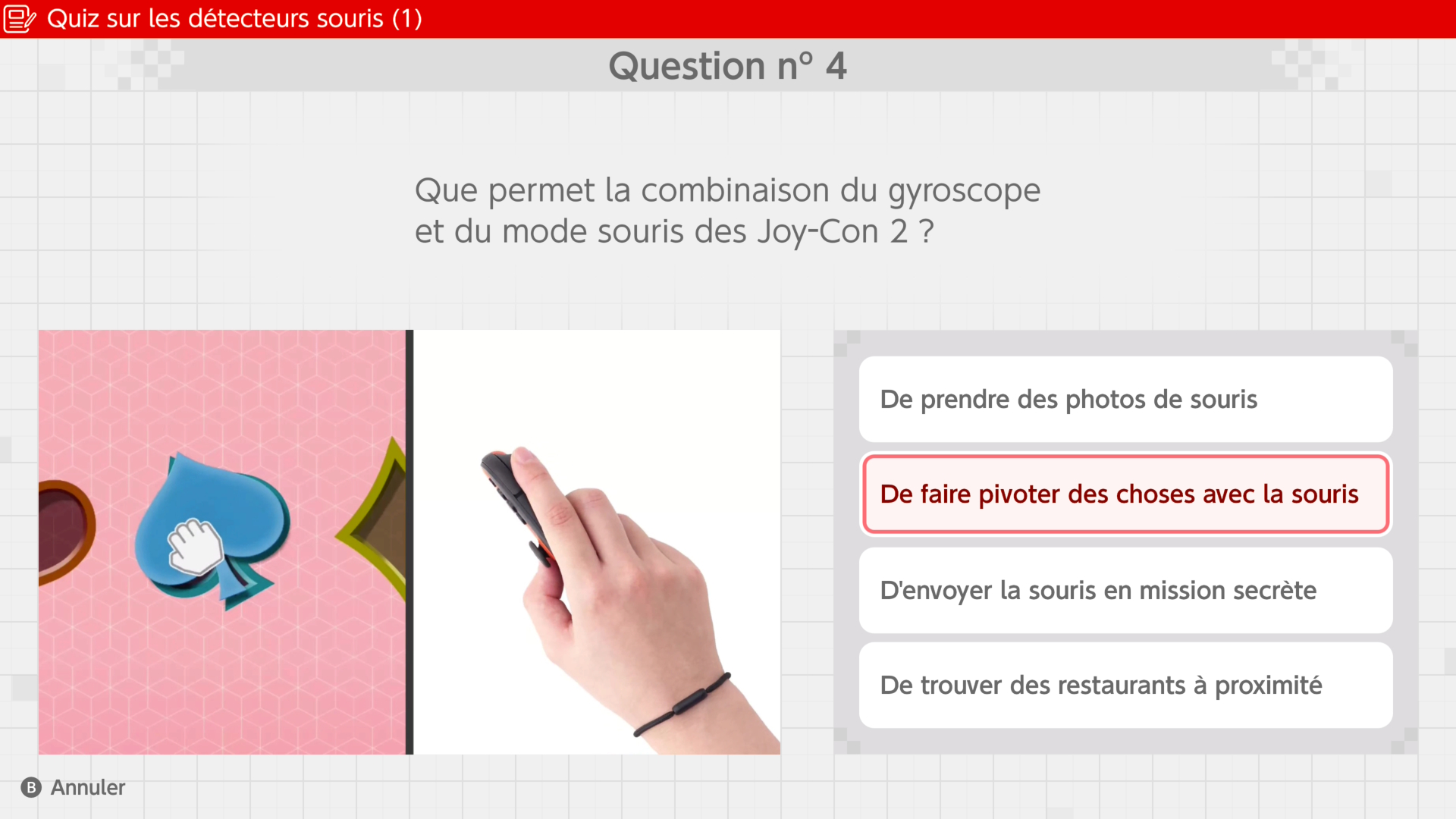 Viennent enfin les mini-jeux, pour « s’amuser » avec les fonctionnalités offertes par la nouvelle console hybride. Le premier stand qui se dresse sur notre route fait partie de celui que vous avez certainement déjà vu, où il faut diriger une soucoupe volante en mode souris, pour esquiver les mines explosives qui nous tombent dessus et croyez-nous, il n’est pas évident de tenir plus de 20 secondes ! Chaque mini-jeu remporté (en obtenant le meilleur temps), vous permettra d’en débloquer de nouveaux. Dans l’ensemble, La grosse majorité des mini-jeux proposés met en avant le mode souris, la plus grosse innovation visible de la Nintendo Switch 2 et il faut avouer que celui-ci s’avère plutôt convaincant, moyennant un support adapté. Oubliez les tables de salon en verre par contre, préférez-lui la surface de votre jeans, ou un tapis de souris adapté. Couplé avec l’autre Joy-Con, un autre mini-jeu vous permet d’éprouver un mode « fps », à savoir un Joy-Con pour diriger et un autre pour viser et tirer. La sensation de précision dans ce mode était fort agréable et rappelait les meilleurs moments de viser / tirer de Resident Evil 4 sur Wii. D’autres mini-jeux permettront de coupler le mode souris, avec les vibrations et les gyroscopes, par exemple pour deviner des formes à l’aveugle, mais aussi pour résoudre un mémory (toujours au toucher).