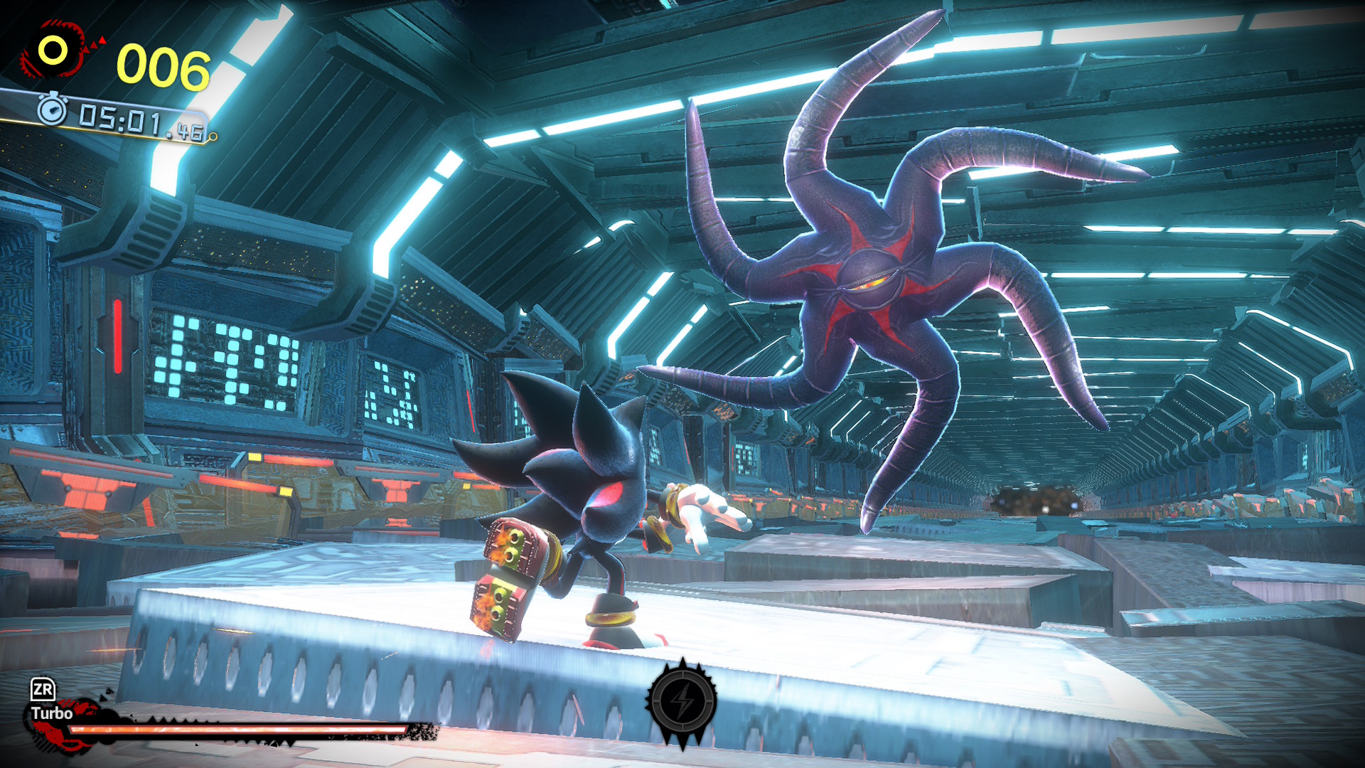 Car oui, la véritable nouveauté de cet opus est apportée par Shadow Generations, faisant plus ou moins figure de DLC mais dans un esprit plus « Bowser Fury », vous voyez l’idée ? L’histoire de Shadow Generations est plutôt bien écrite et s’inscrit en parallèle de celle de Sonic Generations. L’arrivée du time eater était un prétexte acceptable au retour des Black Arms. Alors qu’il se trouve sur le vaisseau spatial Ark, Shadow se retrouve confronté au time eater. Celui-ci le projettera alors dans le monde blanc, un hub permettant de parcourir les différents niveaux qui composent son aventure dans un environnement entièrement en 3D, comme dans Sonic Frontiers. Ce hub fait d’ailleurs écho à celui de Sonic Generations qui, pour sa part, était à parcourir en 2 dimensions.