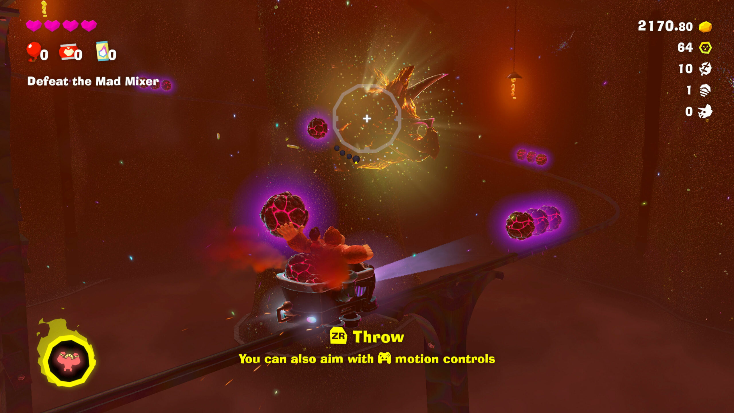 Nous avons eu des phases de destruction, mais aussi des phases de platformer (en 3D… mais aussi en 2D), des arènes, de la réflexion et des boss. Pour donner quelques exemples, nous avons creusé dans le sol pour esquiver des lasers, nous avons combattu un boss en se déplaçant dans un wagonnet de mine (et en lançant des bombes) et nous avons détruit le décor… en douceur afin d’éviter les ronces dissimulées sous les couches de terre.