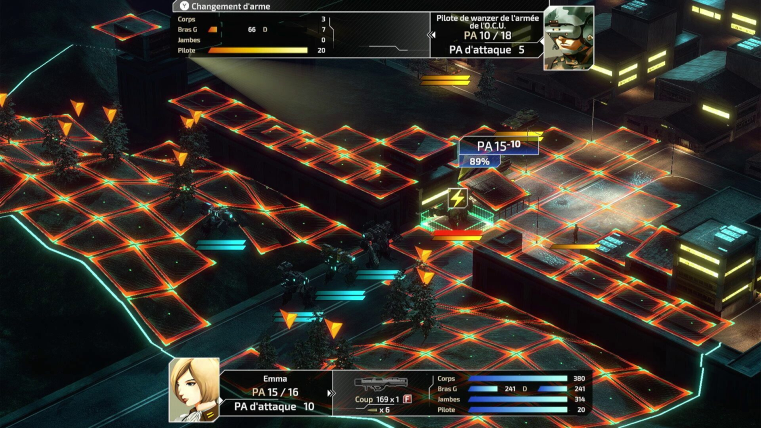 L’une des grandes forces de la série – et toujours présente ici – est la destruction ciblée. Chaque Wanzer est composé de plusieurs parties : tête, corps, bras droit, bras gauche et jambes. Il est possible de viser spécifiquement ces segments, chaque dommage ayant des conséquences stratégiques. Un bras détruit empêche l’utilisation de l’arme qu’il tenait, des jambes endommagées réduisent les déplacements, et la destruction du corps entraîne l’élimination immédiate de l’unité.