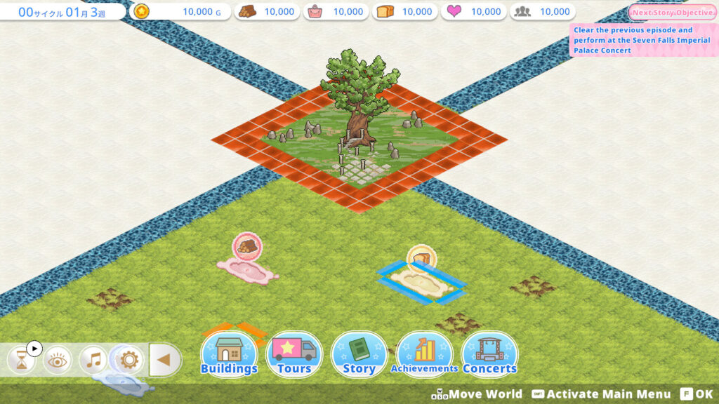 Le cœur du gameplay repose sur une double mécanique : construire une ville et faire évoluer des idoles à travers des concerts inspirés de jeux de rythme. Le joueur devra poser routes, bâtiments, scènes et autres infrastructures pour faire croître la Fanctuary, attirer des fans, récolter des Likes et débloquer de nouveaux spectacles. Chaque succès permet d’avancer dans l’histoire principale mais aussi dans les récits personnels des idoles rencontrées.
