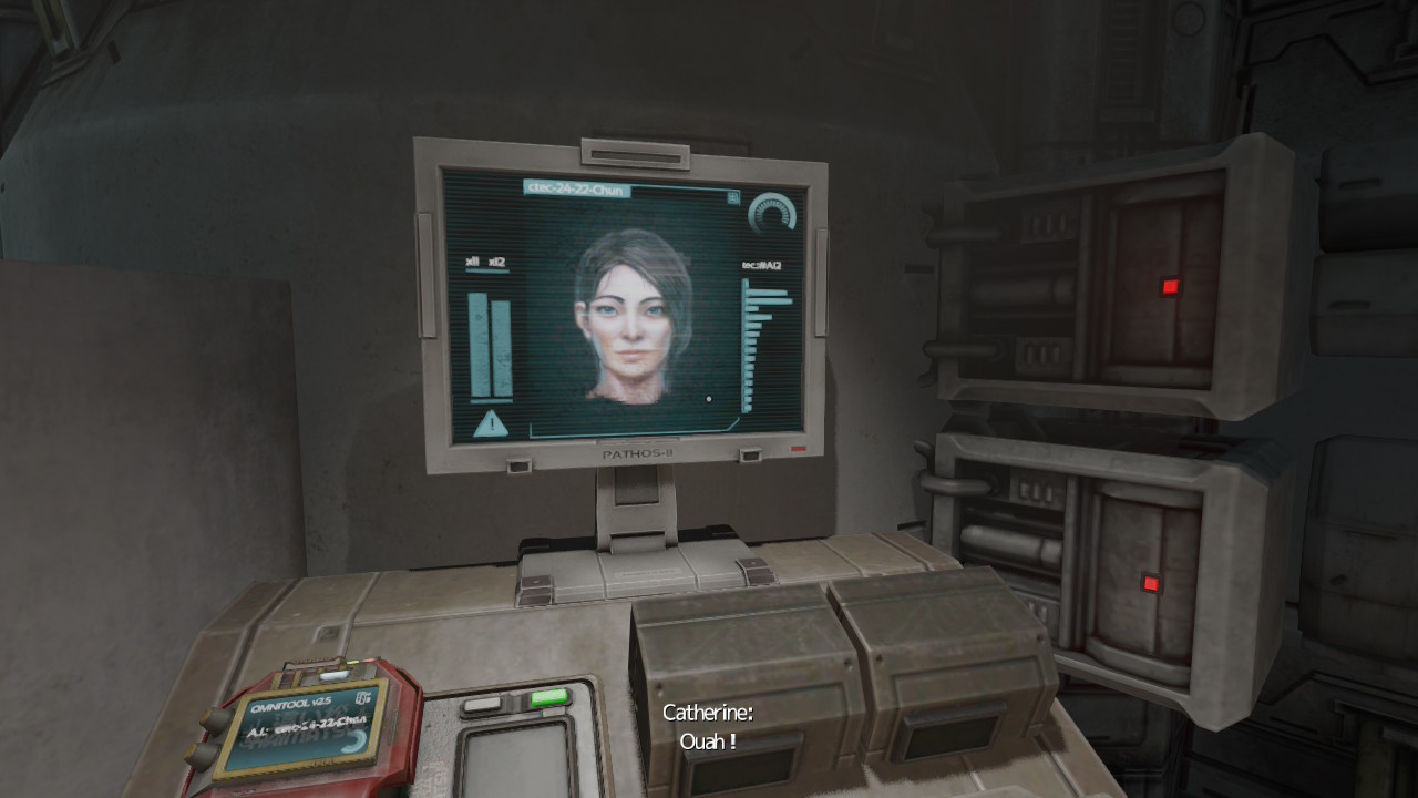 De ce point de vue là, Frictional Games sait comment y faire. Ainsi, nous dirigeons Simon en vue à la première personne. Le personnage peut se déplacer, se baisser, courir et sauter. Notre protagoniste est même capable de ramasser les différents objets qu’il peut trouver autour de lui (chaises, tasses, etc…), ainsi que des documents qu’il est possible de consulter pour en apprendre plus sur l’histoire, la situation de notre personnage, mais aussi des informations comme des codes permettant de débloquer des portes. Certains objets peuvent être lancés. On peut ainsi utiliser une chaise pour briser une vitre et libérer un passage ou alors jeter une tasse contre un mur pour attirer l’attention d’un robot qui en aurait après vous… En effet, même si l’exploration est au cœur du jeu, il arrive que vous soyez poursuivi par des « robots/monstres » durant votre partie. Et oui, vous n’êtes finalement pas si seul sous l’océan. Cependant, n’espérez pas les dégommer à coup de pistolet laser, il faudra faire preuve de discrétion pour éviter de les rencontrer et courir pour leur échapper. La présence de ces ennemis qui vous poursuivent sans relâche ajoute un peu de tension au déplacement, même s’il reste assez aisé de les semer.