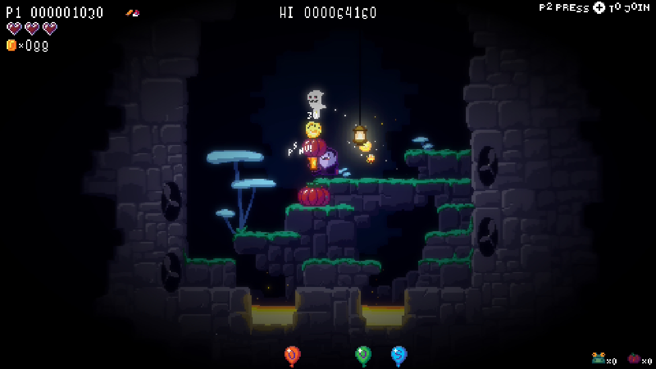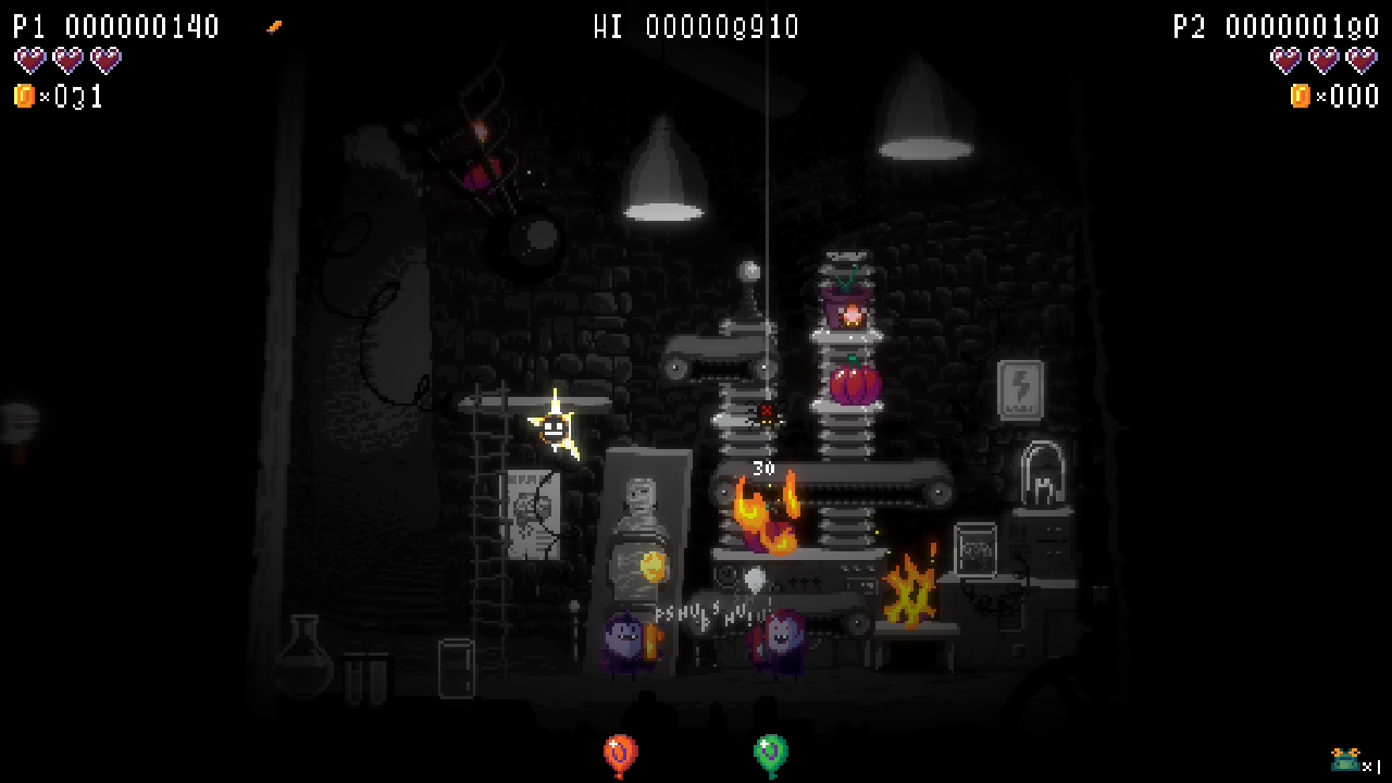 Toutefois, vous n’êtes pas totalement désarmé dans votre bataille, sous réserve d’argent. En battant les ennemis, vous récolterez des pièces (chaque ennemi en laisse tomber 1 à 4 – parfois même 0). Vous pouvez également en gagner à la fin d’un niveau dans lequel vous avez excellé, grâce à l’apparition d’un coffre en renfermant quelques-unes supplémentaires. Avec elles, vous pourrez acheter des objets visant à améliorer votre personnage, comme un spray un peu plus puissant (qui gagnera 3-4 pixels d’envergure), des baskets pour avancer plus vite, un cœur supplémentaire (plutôt bienvenu) et un aimant pour attirer vers vous les pièces à proximité. De notre côté, on vous recommandera cet ordre pour augmenter vos capacités, surtout que ces améliorations sont loin d’être données comparé aux pièces que l’on gagne dans les niveaux. Outre cela, vous pouvez également acheter des pièges pour vous aider dans vos affrontements. Cela donne une petite dimension « Tower Défense » au jeu. Ainsi, vous pourrez investir dans une grenouille à la langue bien pendue, un bonhomme de neige qui lancera des boules, une fleur avec jet à triple diffusion pour augmenter le rayon d’action et enfin des citrouilles piégées qui se déclencheront quand les ennemis tenteront de les emporter… Bien évidemment, ces objets sont chers et leurs effets de base ne sont pas fous (exceptée la citrouille piégée). Cependant, vous aurez la possibilité d’améliorer ces pièges (en augmentant la longueur de la langue de la grenouille ou en réduisant le temps d’attente entre deux déclenchements…) Cette fois, ce sera en échange d’étoiles que vous pourrez faire évoluer les pièges (attention, il faut appuyer sur Y pour valider dans les menus). Celles-ci sont remportées en réussissant un niveau sans perdre de citrouille en route, ou en passant un niveau avec les 5 ballons formant le mot bonus. Les étoiles dépensées pour améliorer un piège peuvent être re-dispersées gratuitement de façon différente, un bon moyen de trouver les meilleurs atouts pour défendre les précieuses citrouilles de votre papa. Bien entendu, ces pièges auront un coût plutôt élevé, mais sachez que vous en obtiendrez gratuitement après avoir affronté les boss.