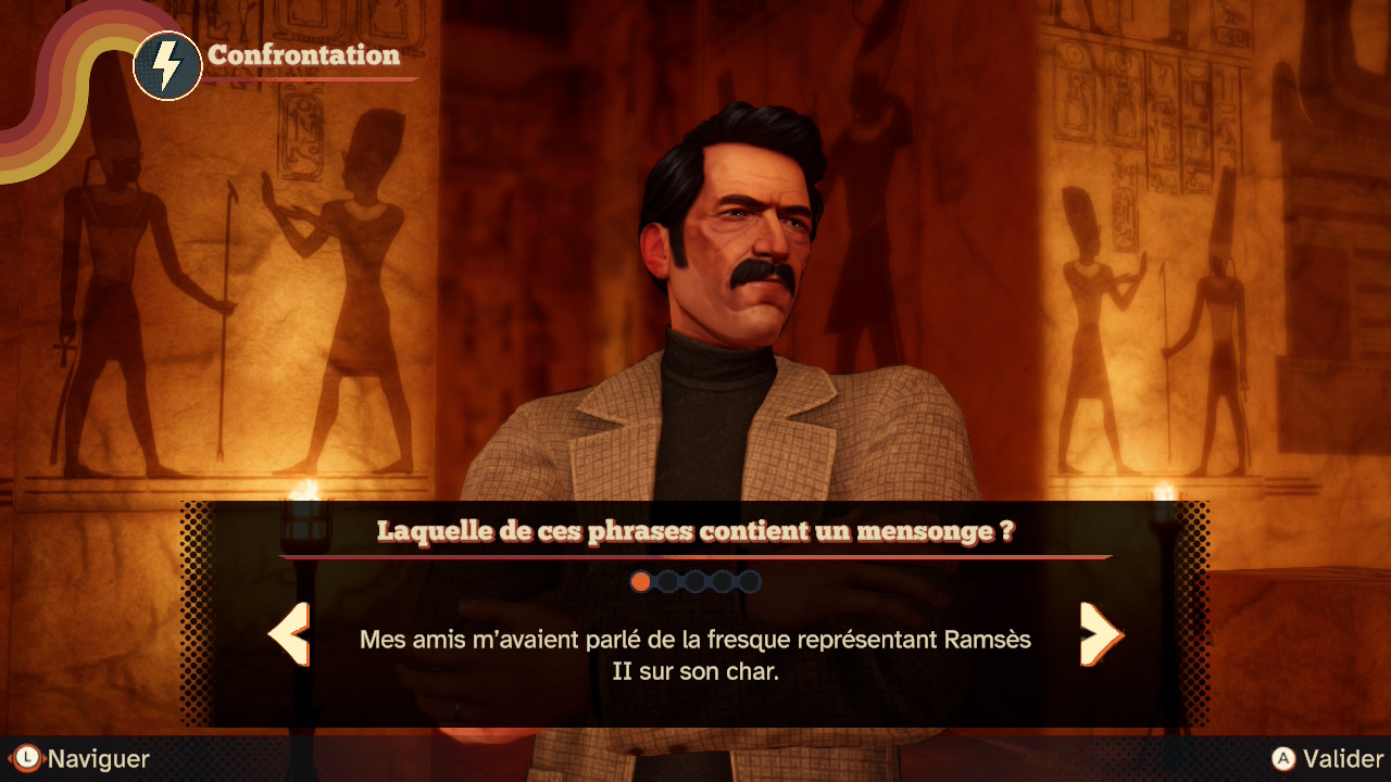 Alors oui, la bande-son fait très jazz des années 70 et tourne parfois à la musique d’ascenseur à certains passages ou lors de la résolution de certaines énigmes (on pourra alors à loisir couper le son le temps de la résolution). Toutefois, nous nous devons de souligner l’effort fait sur la version française (intégrale textes ET voix) comme c’est toujours le cas avec Microids. Ce sont des comédiens de doublage reconnus qui assurent parfaitement leur interprétation (on peut citer Julien Chatelet dans le rôle de Poirot, mais que vous connaissez peut-être également pour son interprétation de All Might dans My Hero Academia). Ce doublage (de qualité), renforce un peu le côté film d’animation/Visual Novel interactif et c’est pour le mieux. Le découpage en chapitre permet également de reprendre l’aventure après une petite pause. Histoire de reposer nos petites cellules grises entre deux casse-têtes un peu retors.