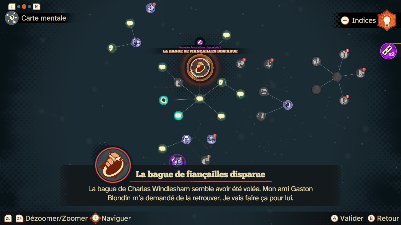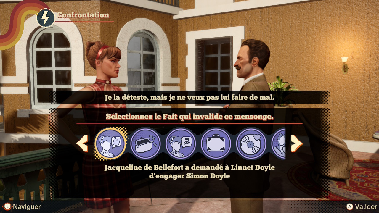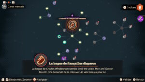 Pour le reste, le jeu propose toujours l’impressionnant système de la carte mentale qui permet d’établir des liens entre les personnages et les objets afin de tirer les bonnes déductions qui feront progresser l’histoire. On s’amuse à faire assez facilement des liens entre ces derniers. Ce nouvel opus intègre également la possibilité de confronter certains suspects, pour éclairer l’enquête ; à l’image des liens de la carte mentale, vous pourrez user de paroles entendues ou d’objets trouvés pour mettre en avant un mensonge raconté par un personnage. Enfin la plupart des chapitres se termineront par une reconstitution mentale dans laquelle Hercule (ou Jane) pourront se déplacer tel des fantômes dans les lieux où ils enquêtent, pour positionner les personnages et les actions qu’ils faisaient aux différentes heures de l’intrigue afin de faire une reconstitution. Le jeu propose également un système « d’espionnage des conversations », ainsi lorsque deux personnages au loin discutent ensemble, une oreille apparait au-dessus d’eux. En l’activant vous les entendrez chuchoter, il faudra alors vous positionner correctement pour écouter ce qu’ils se racontent.