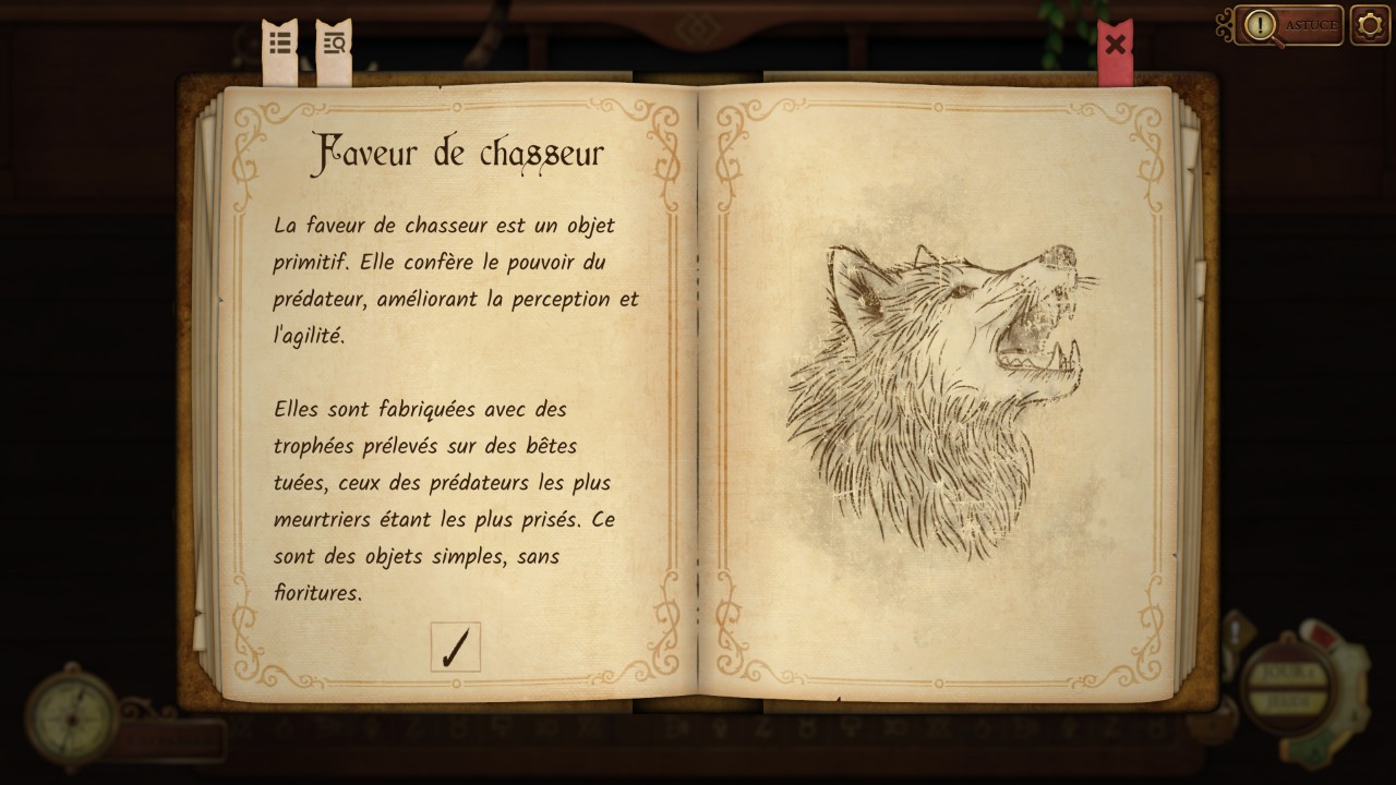 Nous avons aussi avec nous un dictionnaire des symboles qui peut nous aiguiller vers la solution. Il y a par exemple fort à parier qu’un totem de bougie aura le symbole à la fois du feu et de la cire. Nous débloquerons d’autres livres par la suite qui seront tout aussi importants pour mener nos recherches.
