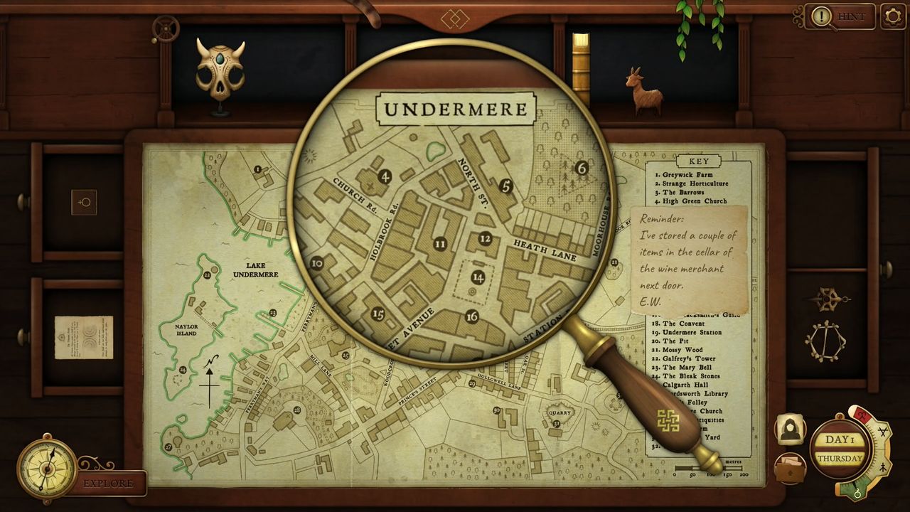 Nous devrons alors ouvrir la carte de la ville (nous en découvrons de nouvelles par la suite) et indiquer le lieu de nos recherches pour trouver de nouveaux bibelots. Les énigmes sont diverses et variées et nous amènent par exemple à décoder des croquis approximatifs ou à comprendre des devinettes.