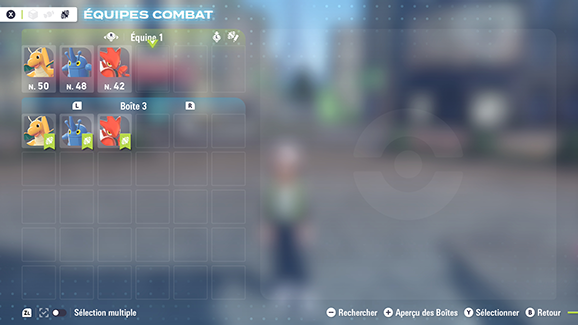 La première chose à faire est de composer une Équipe Combat. Rendez-vous dans le menu principal, puis dans « Boîtes », et appuyez deux fois sur le bouton X pour passer de votre équipe actuelle à votre Équipe Combat. Préparez cette équipe aux combats classés en sélectionnant trois Pokémon depuis vos Boîtes. Vous ne pouvez pas sélectionner de Pokémon présent dans votre équipe actuelle, alors pensez à déposer les Pokémon avec lesquels vous souhaitez participer aux combats classés dans vos Boîtes au préalable.