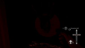 Nous avons une endurance de foi qui se recharge grâce à des chapelets. Nous avons finalement de la vie (quand les démons nous attaquent) qui, elle aussi, se recharge à l’aide de trousses de soin. Nous trouvons ces trois objets en fouillant la maison, à des endroits plus ou moins cachés (dans un placard, sur une statue, etc.).