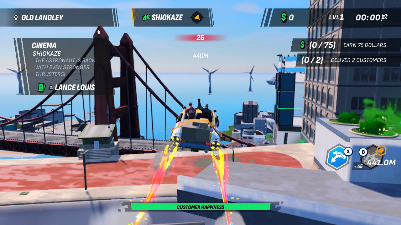 Le pitch est le suivant : vous incarnez Vinny, dernier chauffeur de taxi humain de San Valeda, face à la flotte maléfique de TaxiBot Corp. La ville change, l’IA vous pourchasse, les passagers ont des effets sur l’environnement. Une prémisse correcte pour un jeu d’action-arcade. En pratique, l’histoire se résume à des bouts de dialogues lus avec une platitude désarmante, plaqués entre les courses. Son « côté dans l’air du temps » (une rébellion humaine contre l’IA) est si maladroitement traité, si dépourvu de mordant ou d’humour, qu’il en devient instantanément oubliable et parfaitement inutile. On ne joue pas pour le scénario, c’est entendu, mais quand il se met en travers du chemin avec autant de lourdeur, il devient une nuisance.