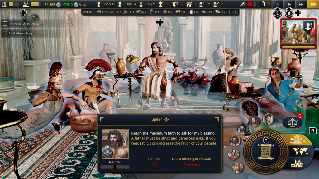 La troisième dimension implique les divinités du Panthéon romain. Vous pouvez choisir de gagner leur faveur ou de les défier, sachant que chaque décision influence profondément votre partie. Les temples et les offrandes attirent les bénédictions divines, mais les dieux se montrent capricieux et impitoyables : vénérer l’un peut provoquer la colère d’un autre. Ils descendent parfois sur terre pour vous aider ou punir votre peuple, créant un récit non linéaire et rejouable rempli de rencontres mythiques. Cette interaction divine garantit que chaque partie propose des défis, artefacts et missions différents.
