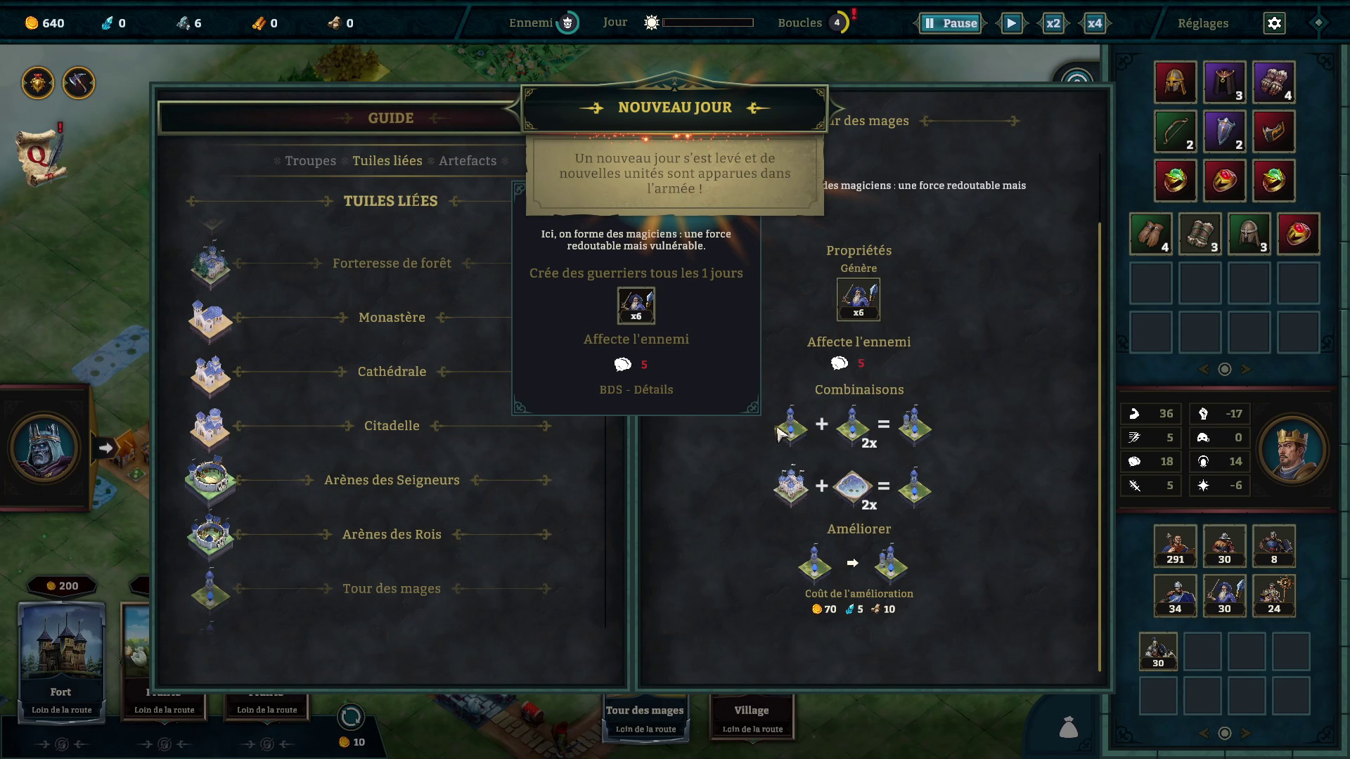 Mais ce n’est pas tout ! Comme dans Loop Hero, Kingdom Loop est un jeu où les bâtiments peuvent créer des mini-synergies pour devenir plus puissants. En entourant un lac de deux autres lacs, ce dernier se transforme en lac profond avec des statistiques améliorées. En plaçant un village autour de deux forêts, nous la transformons en scierie pour créer du bois ! Le jeu propose plusieurs matériaux comme le bois ou le cristal qui vont nous permettre d’améliorer nos bâtiments mais aussi de détruire ceux des adversaires.