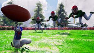 Ce genre de situation est fréquente, mais le jeu propose aussi des événements plus spécifiques : vous pouvez accéder à un terrain de football américain rempli de joueurs. Si vous frappez dans le ballon, ils se mettront à courir pour le récupérer. En revanche, si vous réussissez à l’emmener jusqu’aux cages adverses, ils entreront dans une rage folle et vous attaqueront. En les éliminant, vous obtiendrez un casque de football américain en récompense. Ce genre d’événement est nécessaire pour gagner des glands d’or ou des costumes, lesquels sont indispensables pour progresser et terminer le jeu.