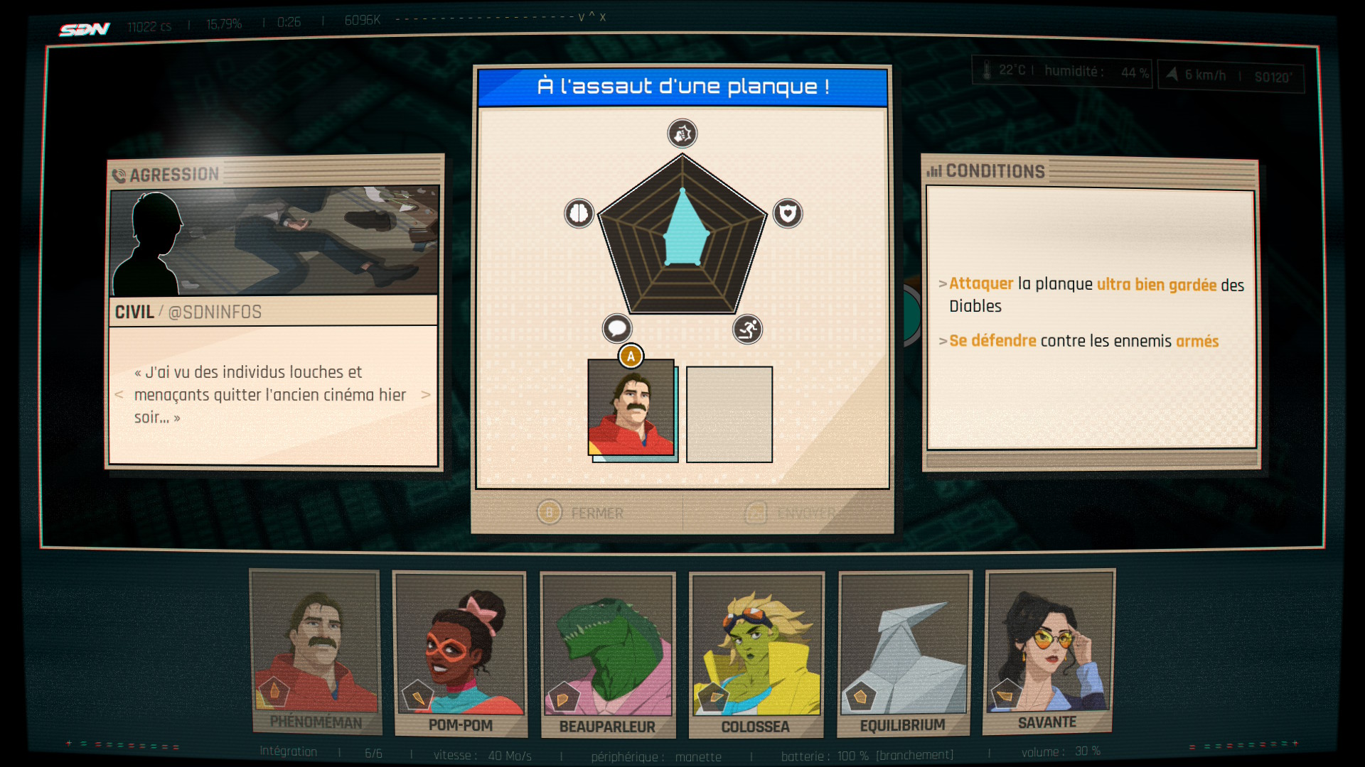 Mais ce qui va être la principale boucle de gameplay va être justement le « Dispatch », le moment où vous allez coordonner vos héros sur le terrain. Chaque héros est régi par 5 statistiques : Combat, Intelligence, Vigueur, Mobilité et Charisme. Les missions vont très souvent avoir des mots en gras pour vous dire ce qu’on attend du héros qui va lui être attribué. Chaque mission a entre 1 et 4 places pour des héros, mais attention à ne pas mettre tous les héros à chaque fois, car plusieurs missions se lancent en parallèle et vous allez régulièrement être à court de héros ! Car oui c’est un petit jeu de gestion. Pas très difficile, il suffit d’être malin et de suivre, nous n’avons pas été mis en difficulté, donc nous avons un peu eu l’impression que l’impact de l’échec est plutôt faible. Mais si par exemple vous ratez la mission où il faut vaincre un kaiju, elle reviendra dans d’autres épisodes et il sera plus puissant.