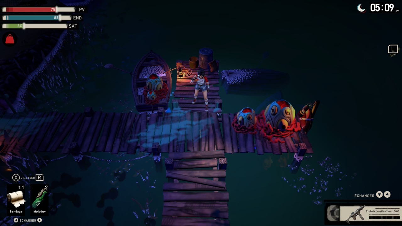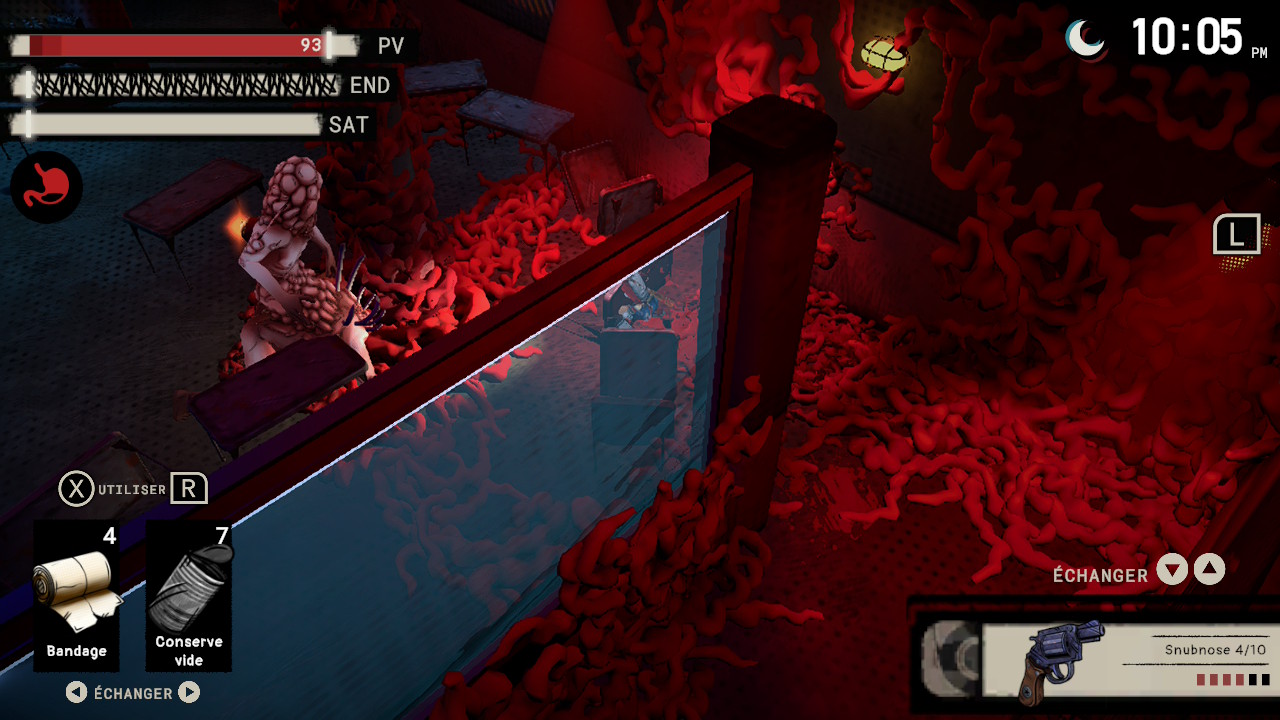 I Hate This Place est donc un jeu de survival horror avec la possibilité de faire du « craft » en se fabriquant des bâtiments pour produire des ressources (un peu comme dans des jeux de stratégie à la Warcraft ou encore certains jeux mobiles). Bon ça fait beaucoup écrit comme ça, mais pas d’inquiétude, nous allons clarifier cela ! I Hate This Place propose donc une vue en 3D isométrique, il est possible de diriger notre personnage dans des environnements en 3 dimensions avec une caméra qui a un angle en vue de dessus en ¾. On dirige notre personnage avec le stick gauche, le stick droit quant à lui est destiné à orienter la direction de nos armes à feu (avec une précision toute relative). Il est également possible de recharger les armes avec un boutons (heureusement), mais aussi de s’accroupir (afin de se déplacer sans faire de bruit). Elena est également capable de courir et d’utiliser des armes de jet comme des grenades ou des conserves explosives avec des clous… ou encore des boîtes de conserve vides pour détourner l’attention de certaines créatures aveugles. Les boutons bas et droit permettent de changer l’arme équipée, alors que les touches haut et gauche permettent de faire défiler les objets liés à la récupération d’énergie ou à la satiété.