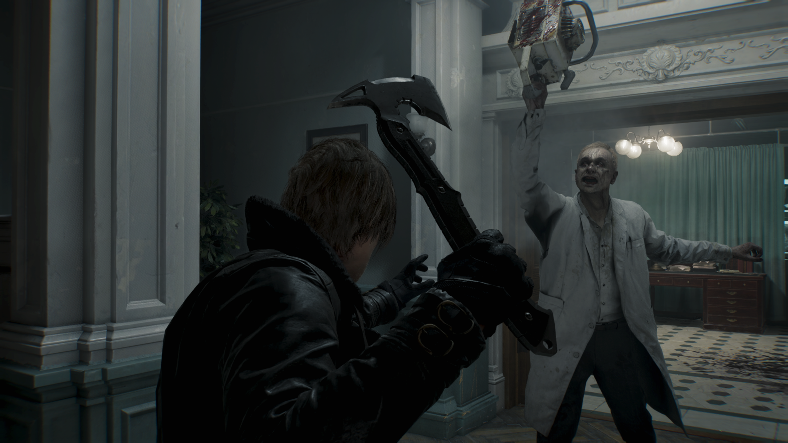 Le terrain de jeu de Leon : à l’opposé, quand on incarne Leon, on passe en troisième personne, et la musique change radicalement. Le vétéran est une machine de guerre. Armé jusqu’aux dents, il dispose d’une hachette de lancer qui ne casse jamais (elle perd juste en durabilité et se répare) et qui lui permet de parer, d’achever les ennemis et de déclencher des combos dévastateurs. On rit franchement en le voyant décapiter les morts-vivants ou décocher ses légendaires coups de pied circulaire. Capcom s’amuse et ça se voit : Leon peut ramasser les armes blanches abandonnées par les zombies ou leur jeter des bouteilles de gaz pour tout faire exploser. Son inventaire passe par un système de mallette façon Resident Evil 4, obligeant à un Tetris constant. Cette dualité est une bouffée d’air : quand l’angoisse devient trop pesante avec Grace, on passe à Leon pour défouler la tension accumulée, et vice-versa.