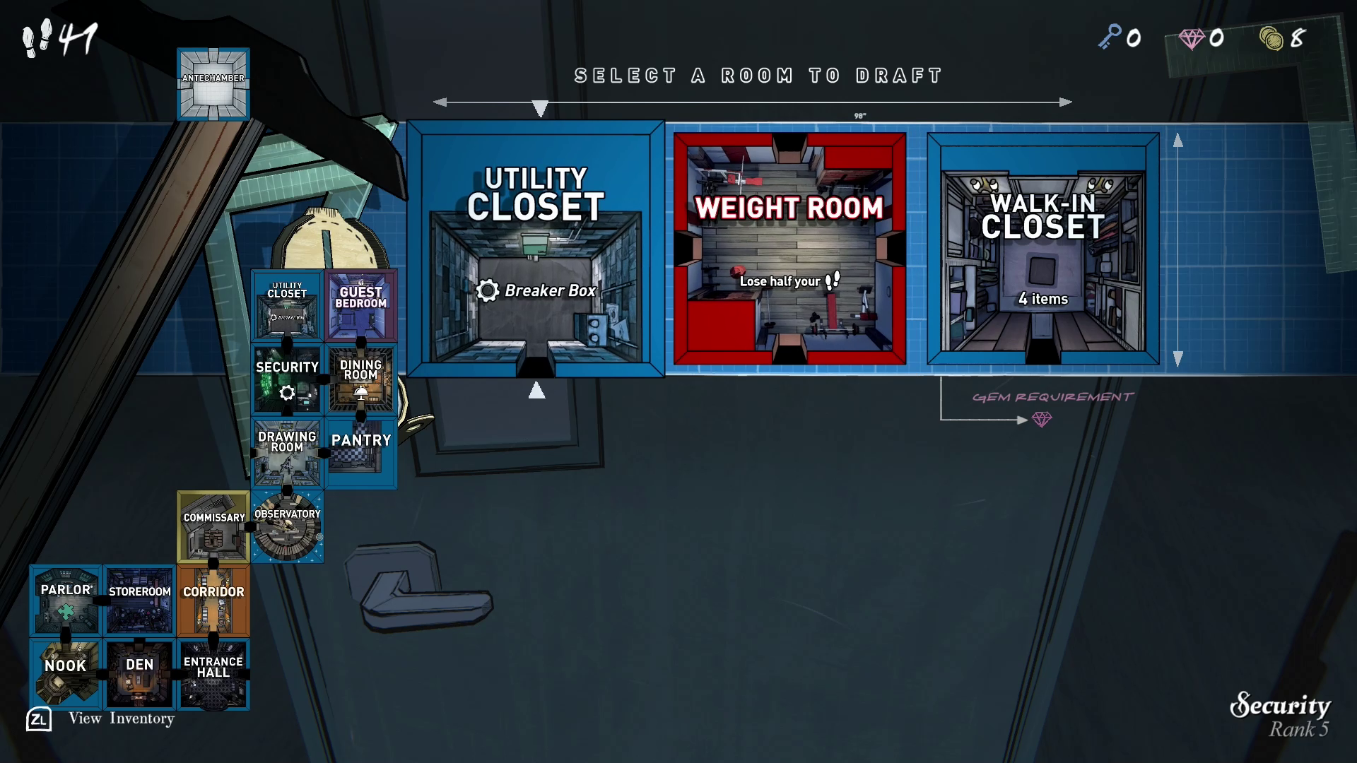 Ce n’est pas tout : dans Blue Prince, nos mouvements sont limités. Nous commençons chaque journée avec cinquante pas. Dès que nous entrons dans une pièce, nous consommons un pas. Même si certaines pièces permettent de recharger (un peu) nos mouvements, il faut toujours veiller à créer un manoir qui évite les trop grands allers-retours, tout en prenant en compte que certaines salles nous font perdre des pas.