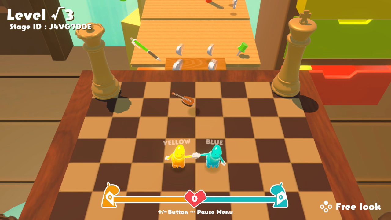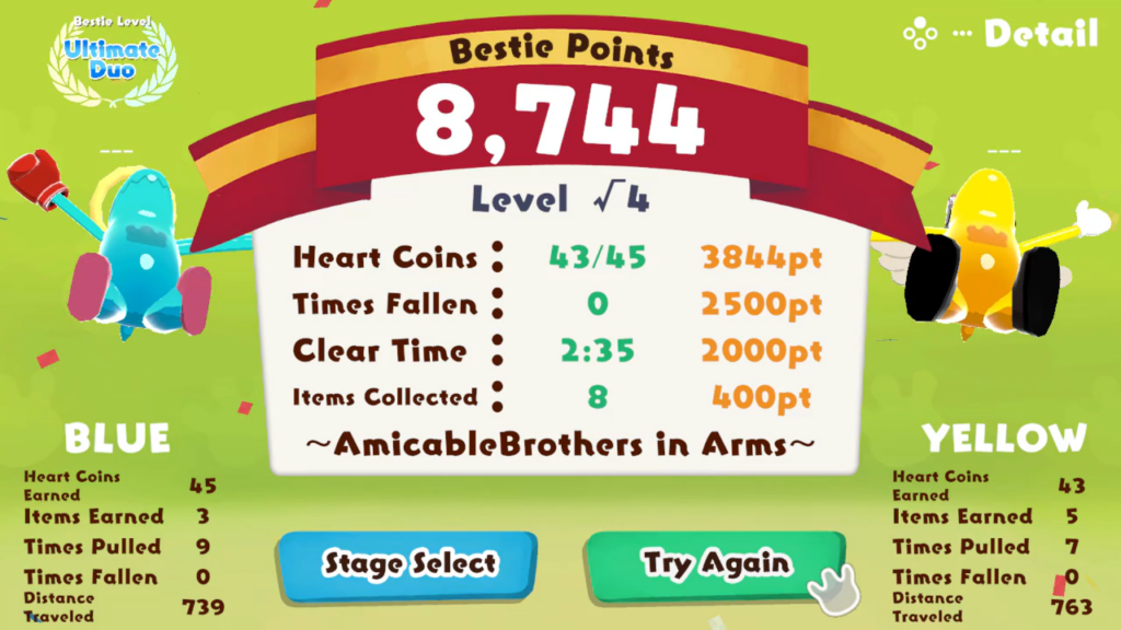 Les stages sont générés aléatoirement et se déclinent sur huit niveaux de difficulté, offrant une combinaison de possibilités quasi illimitée. Il est possible de sauvegarder un stage apprécié et d’en partager l’identifiant avec d’autres joueurs. La coopération locale en canapé et le jeu en ligne sont tous deux disponibles, et un mode solo permettant de contrôler les deux personnages simultanément est également inclus. À la fin de chaque stage, un rang « Bond Level » est attribué en fonction du temps de complétion, du nombre de relances et des cœurs collectés.