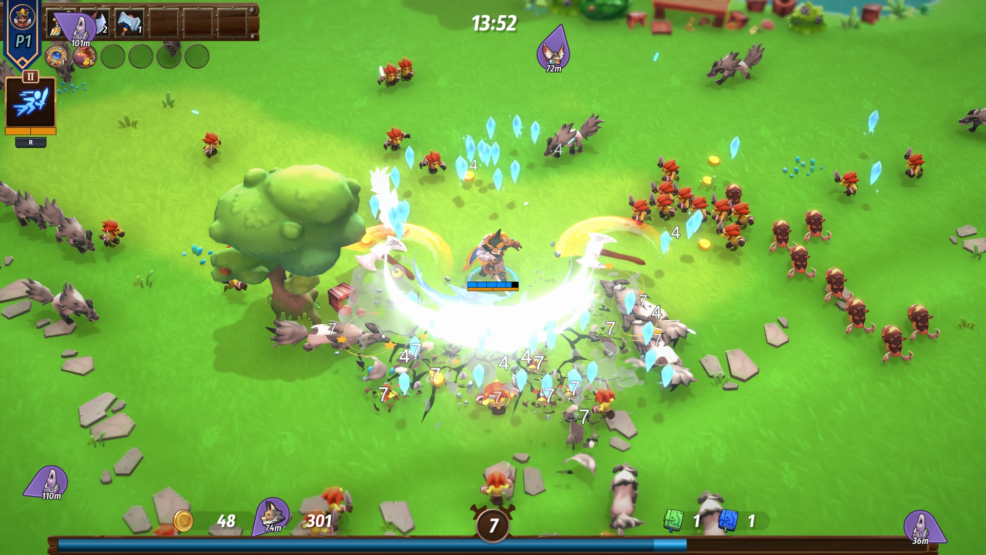 Si le jeu est jouable en solo, on sent rapidement que son ADN est taillé pour le multijoueur. Jusqu’à quatre joueurs peuvent s’associer pour repousser les vagues. Et là, l’alchimie change radicalement. L’écran devient un champ de bataille dantesque où les combos de pouvoirs explosent dans tous les sens. En solo, certains power-ups semblent presque inutiles, leur intérêt étant décuplé quand ils bénéficient à un allié ou créent une synergie de groupe. Le mode coopératif transforme chaque run en une expérience chaotique et mémorable, surtout lors des affrontements contre les boss qui lâchent des stèles colorées.