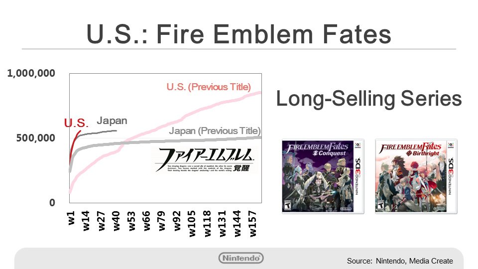 Bien aidé il est vrais par la sortie importante des premiers Pokémon sur Virtual Console : ils se sont vendus à plus d’1,5 million dans le monde (dont la moitié aux États-Unis). Autre nouveau revenu important, les DLC de Fire Emblem Fates. On comprend aisément pourquoi Nintendo a prévu de nouvelles vagues de DLC alors que le jeu a plus d’un an.